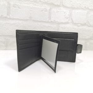 Едно отделение за банкноти със средна преграда, 9 процепа за карти с различна големина, 1 от които е прозрачно, монетник с копче тик-так