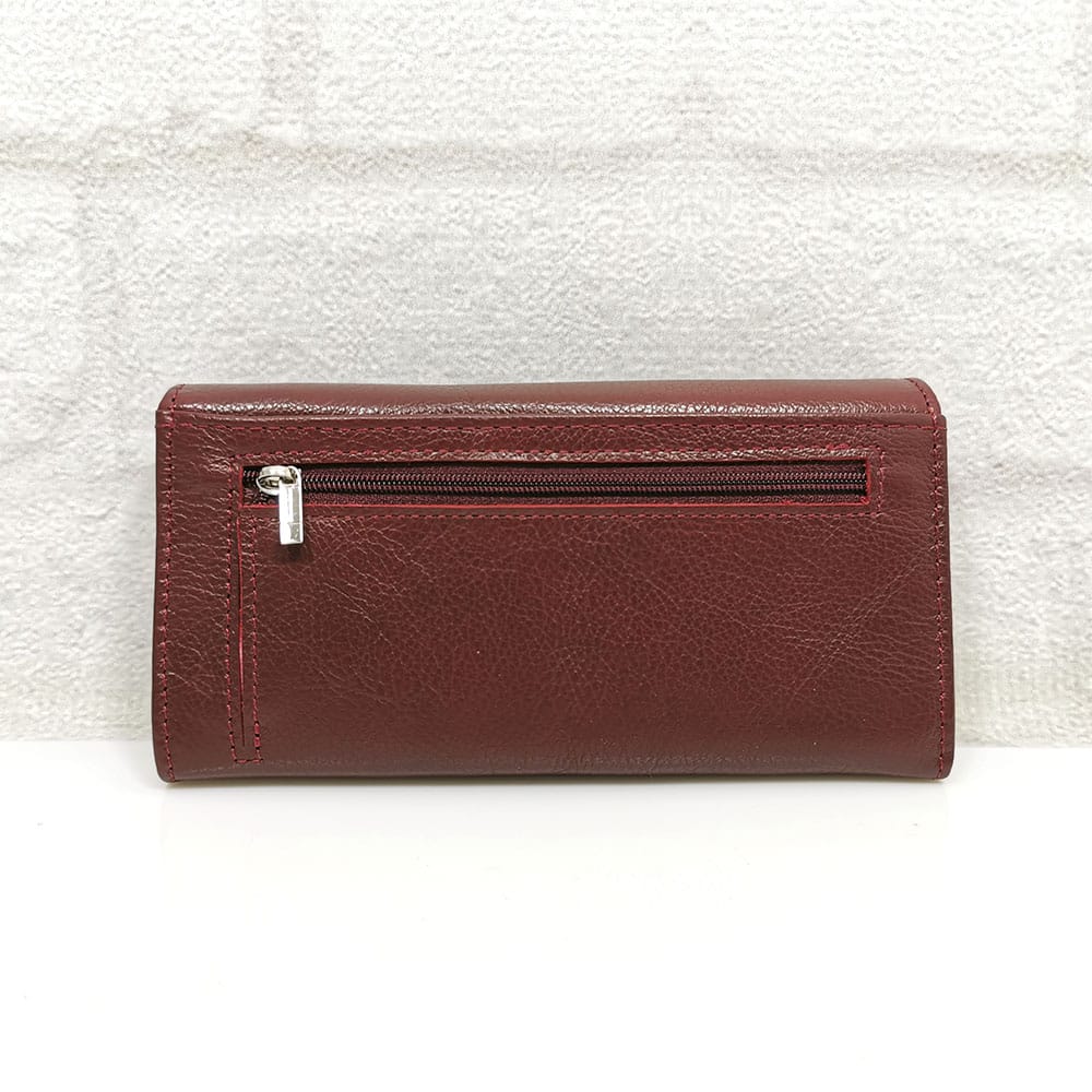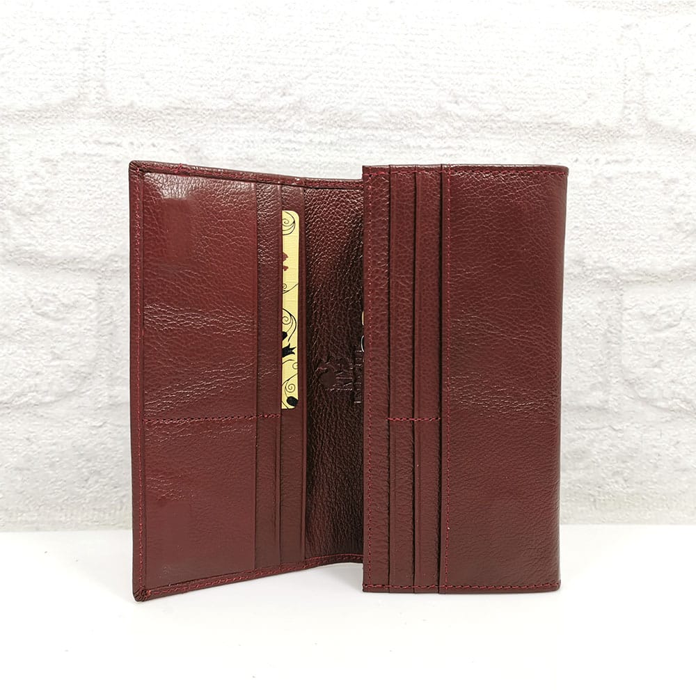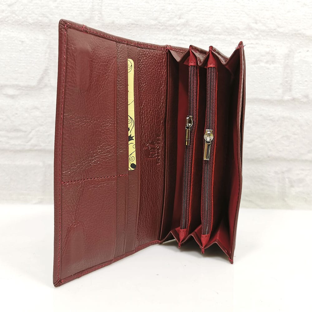 Седем прегради, като 2 от тях се затварят с ципове, 9 джоба с различна големина за карти или визитки, отвън на гърба 2 джоба, като единият е с цип.