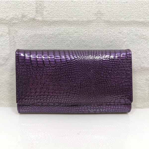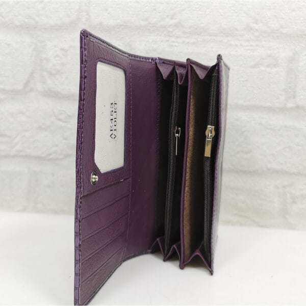 Две отделения- едното е за банкноти и монети с 6 прегради, като двете са с цип и на капака от вътрешната страна има 5 джобчета за карти, като единият е прозрачен. Второто отделение е за карти и визитки с 11 джобчета, като едното е прозрачно и един голям джоб. Затваря се с копче тик-так