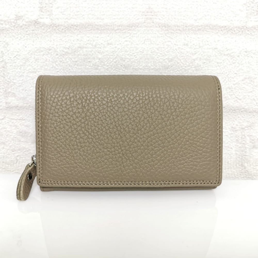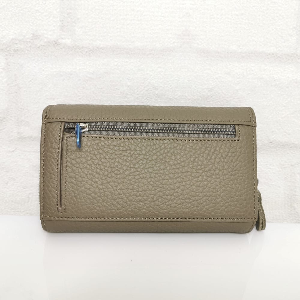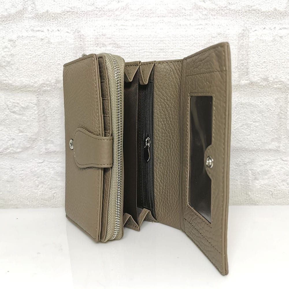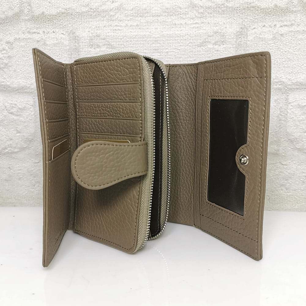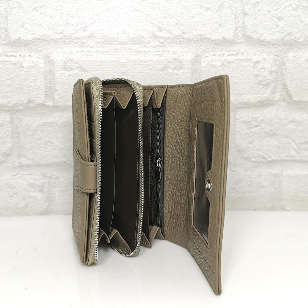 По вертикала една голяма преграда за банкноти, по хоризонтала 6 прегради, едната с цип, голям монетник с преграда с метален цип, падащ борд закопчан с копче тик-так и в него има две големи прегради и 10 малки отделения за карти или визитки, отвън на гърба джоб с цип