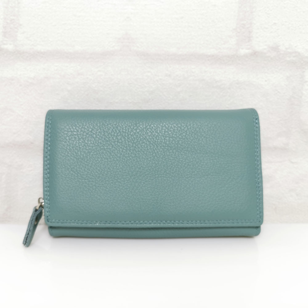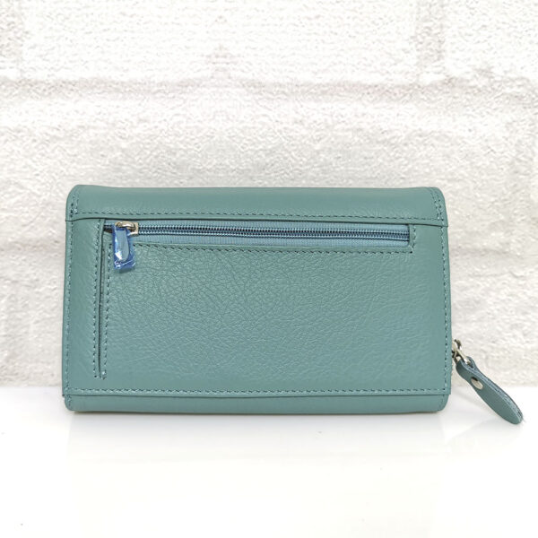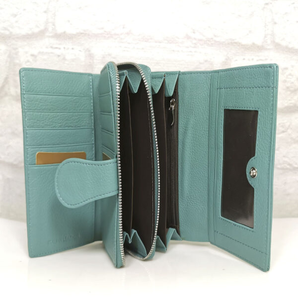 По вертикала една голяма преграда за банкноти, по хоризонтала 6 прегради, едната с цип, голям монетник с преграда с метален цип, падащ борд закопчан с копче тик-так и в него има две големи прегради и 10 малки отделения за карти или визитки, отвън на гърба джоб с цип