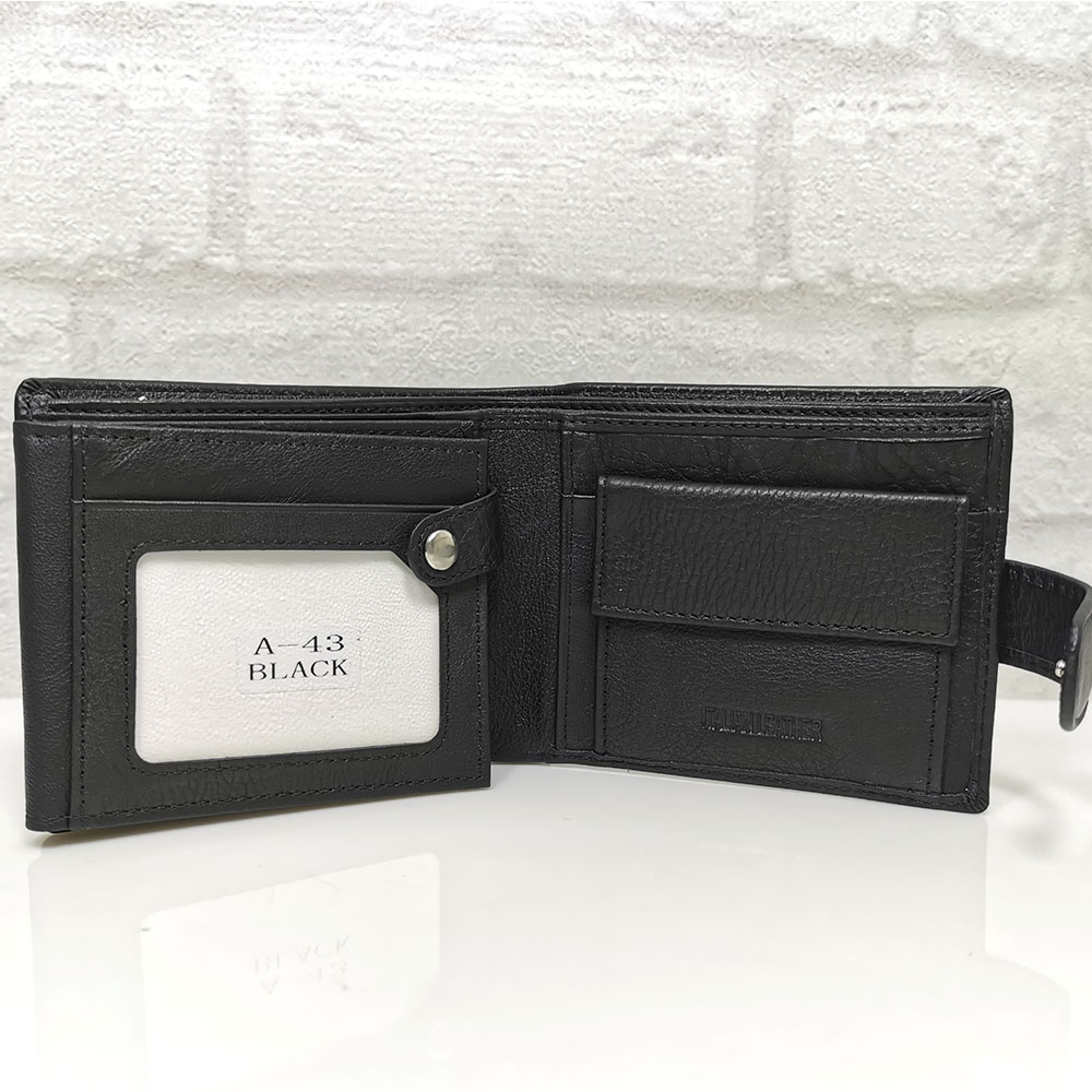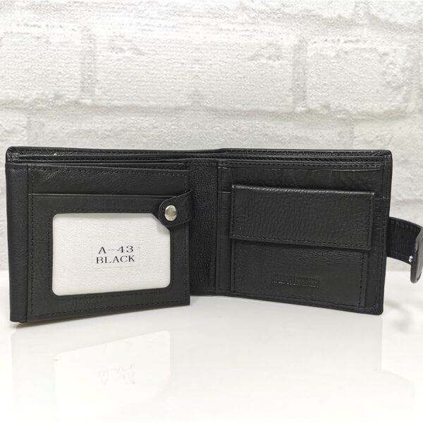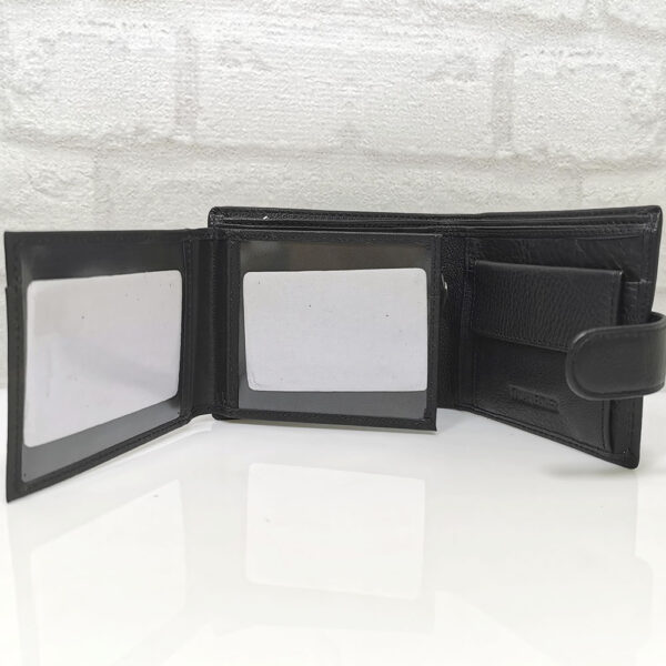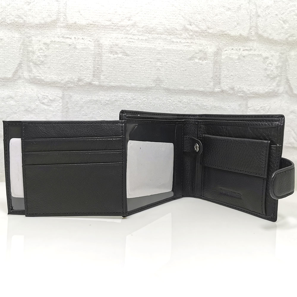 Три отделения за банкноти, като едното е с цип, 8 джобчета с различни размери за визитки или карти, като 4 от тях са прозрачни, монетник с копче тик-так.