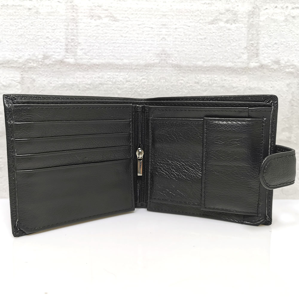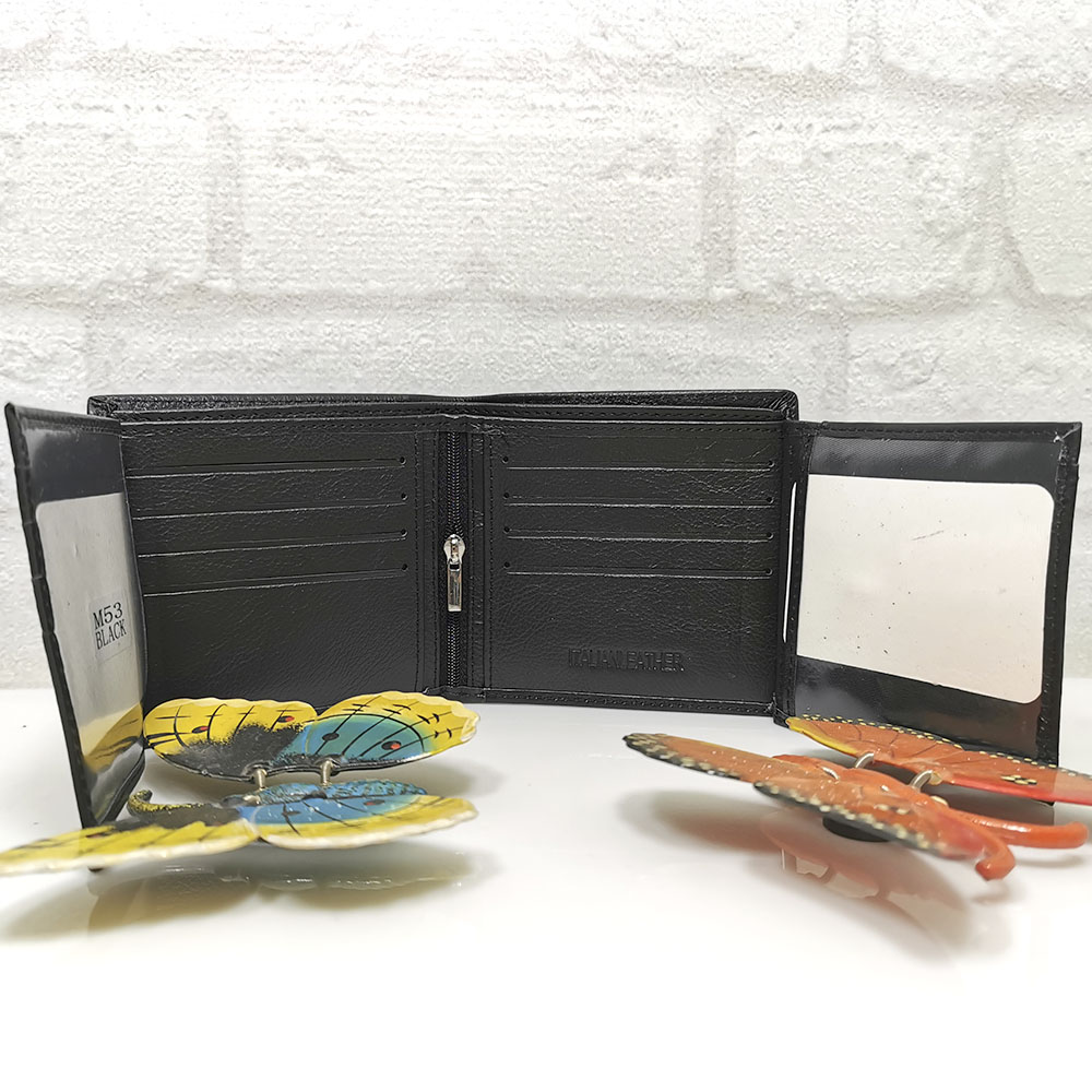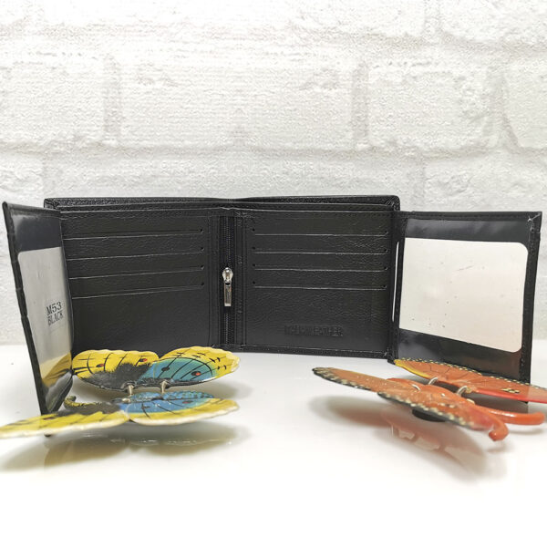 Три отделения за банкноти, като едното е с цип, 16 джобчета с различни размери за визитки или карти, като 1 от тях е прозрачно, монетник с копче тик-так, малко джобче с цип.