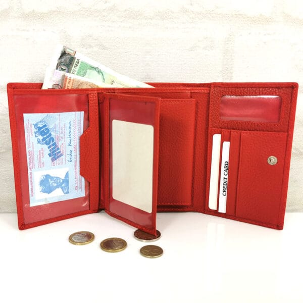 Една дълбока преграда за банкноти , вътрешен монетник с копче тик-так, 10 отделения с различна големина за визитки или карти, като две от тях са прозрачни.