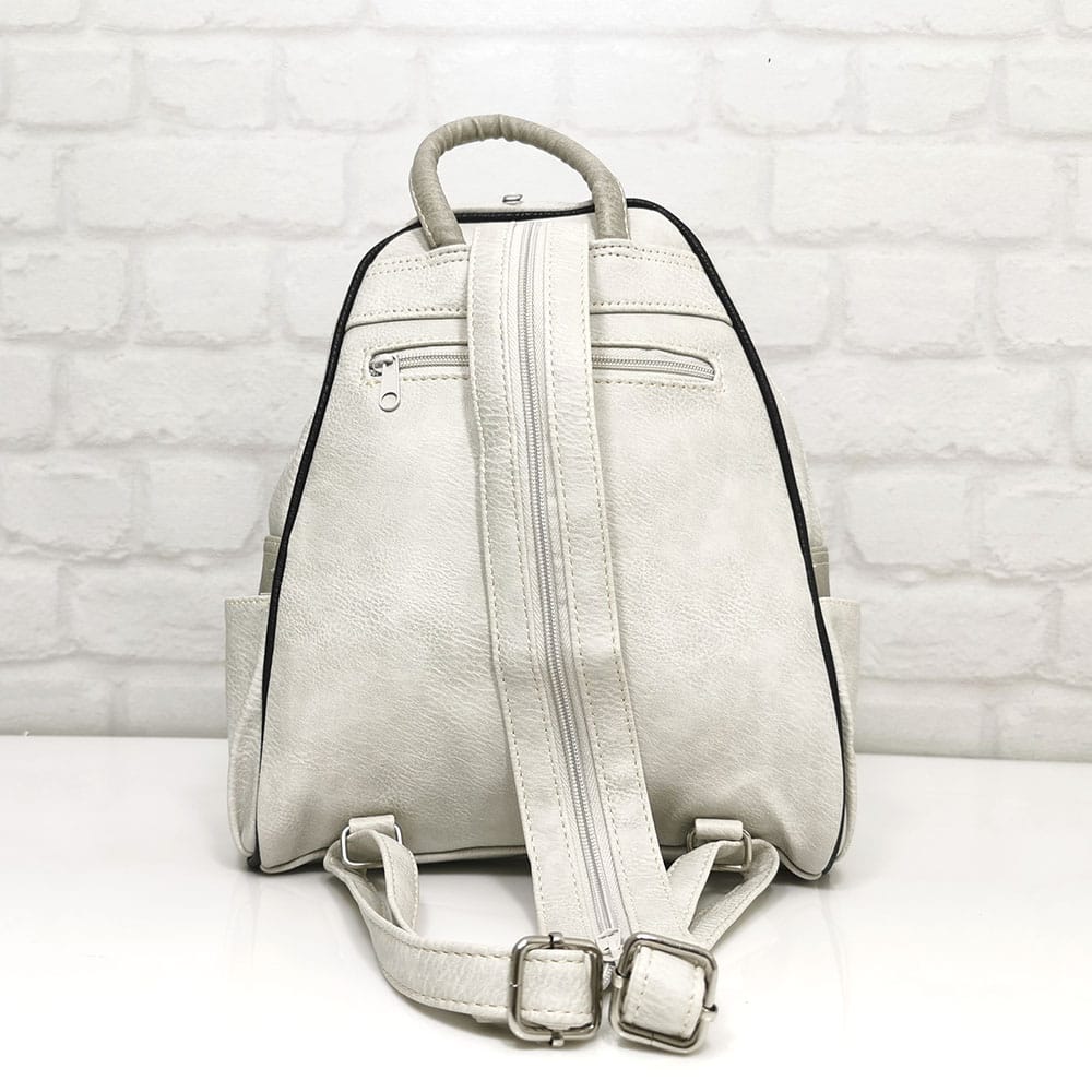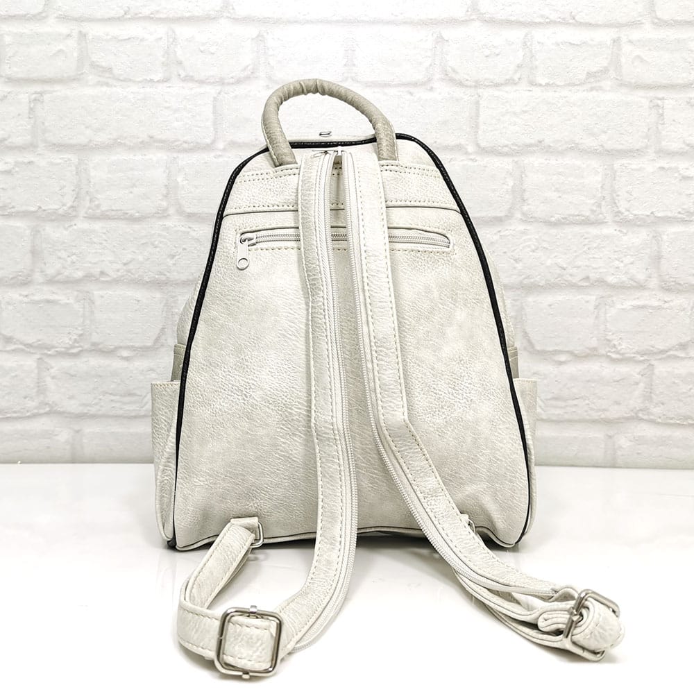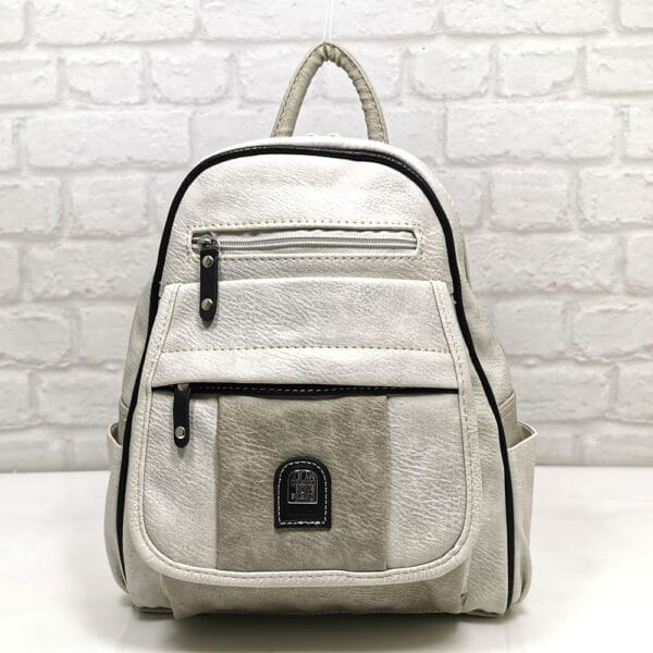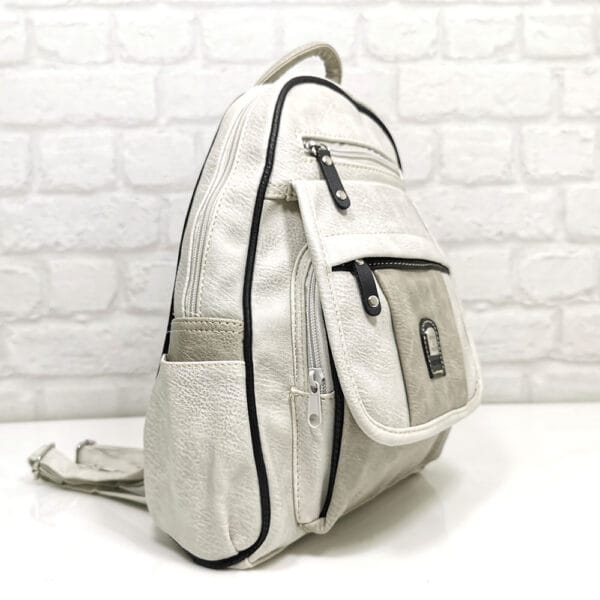 Отвън: отпред- малко джобче с цип, на капака джобче с цип, под капака джоб с цип, две странични джобчета