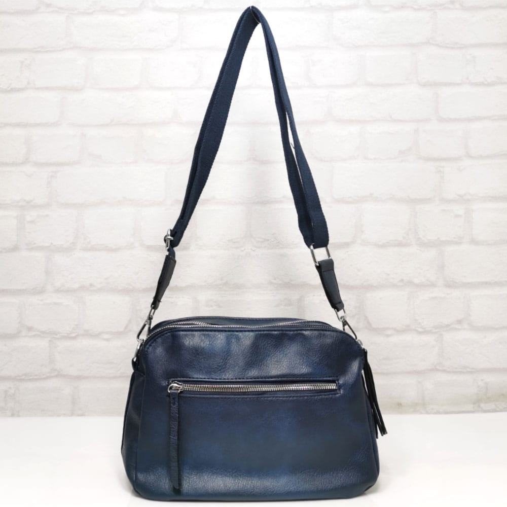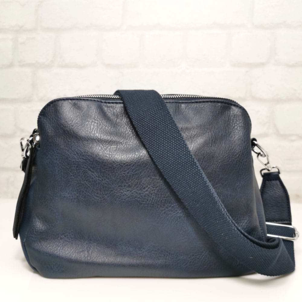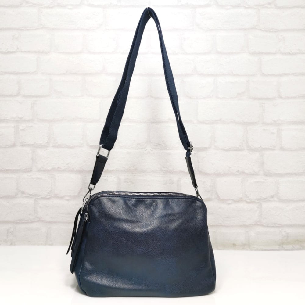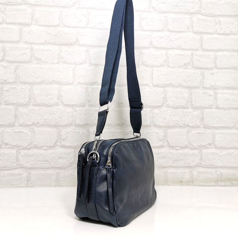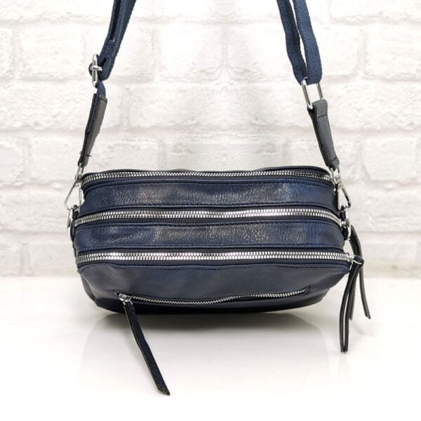 Три еднакво големи прегради, като всяка от тях се закопчава с отделен метален цип, вътре има един малък джоб с цип и два джоба за телефони.