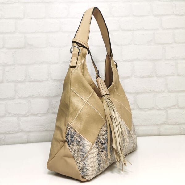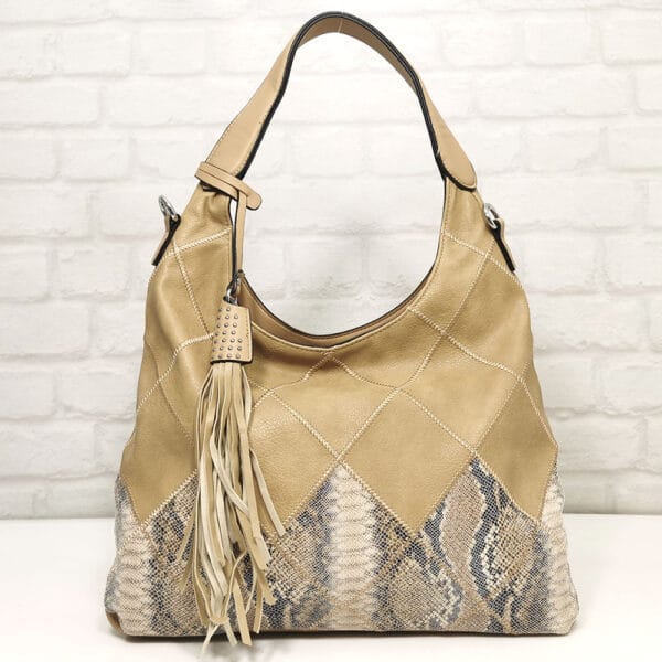 Бежова, гарниран с многоцветен змийски принт, обков сребрист