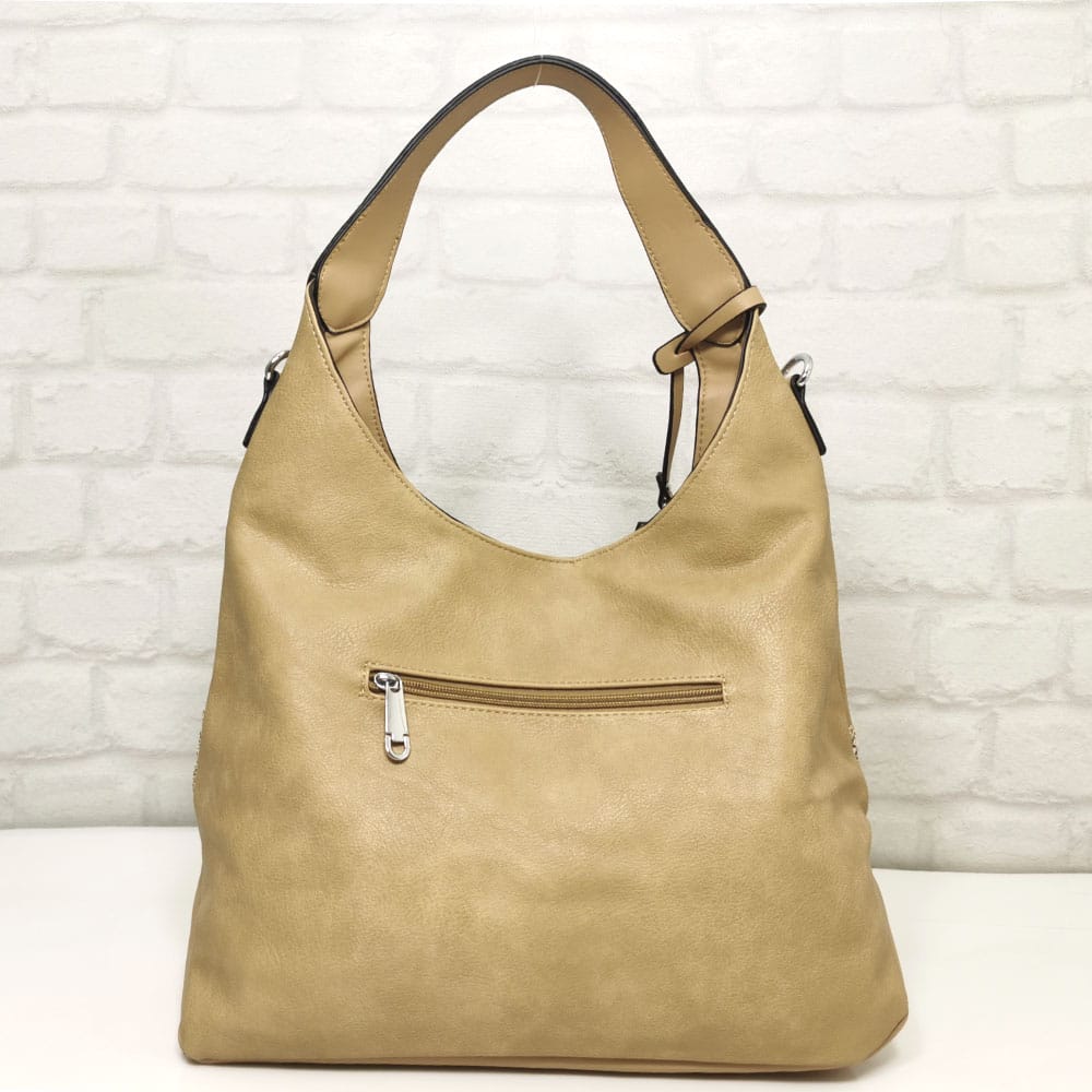 Вътре: средна преграда с цип, малко джобче с цип и два джоба за мобилни телефони.