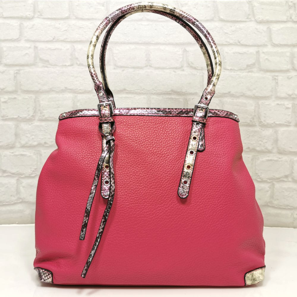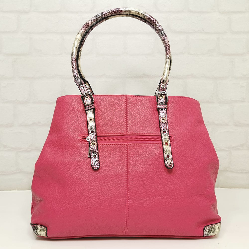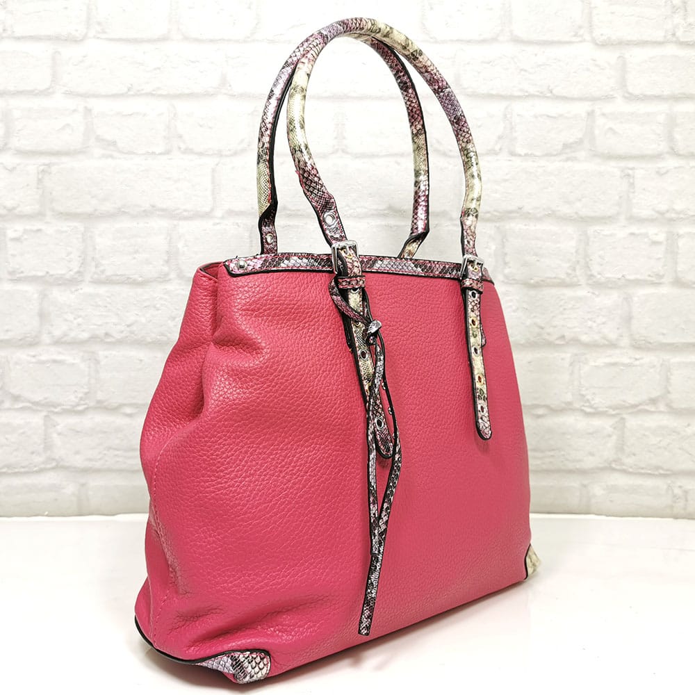 Основен цикламен, дръжки и гарнитура шарен, леко лъскав змийски принт, обков сребрист
