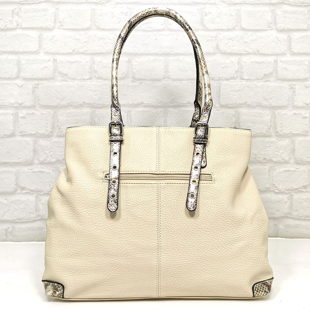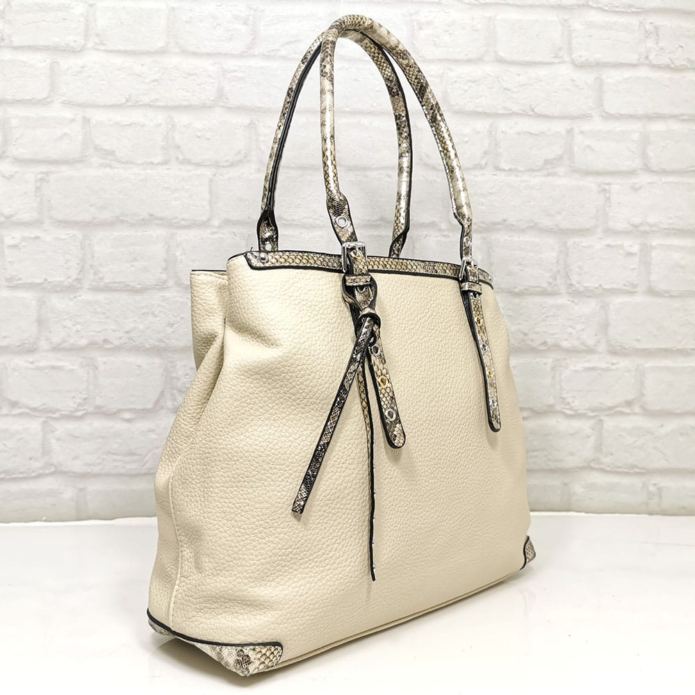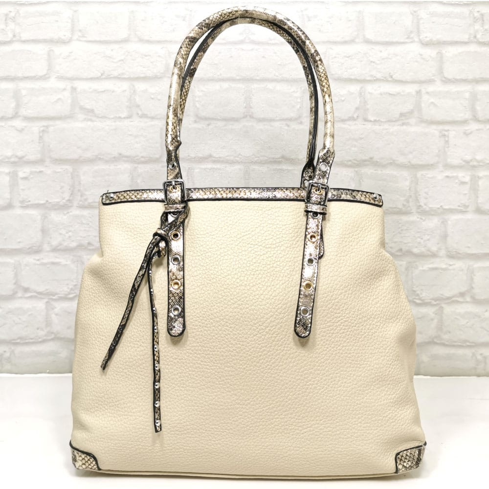Основен екрю, дръжки и гарнитура шарен, леко лъскав змийски принт, обков сребрист