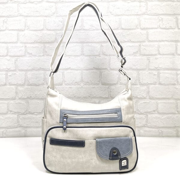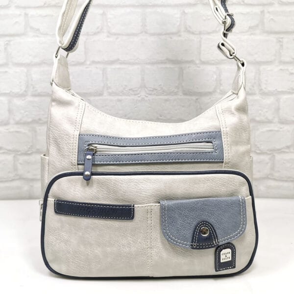 Мръсно бяло, комбинирано с два нюанса синьо и малко черно.