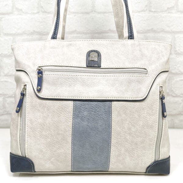 Мръсно бял, гарниран с два нюанса синьо, обков сребрист