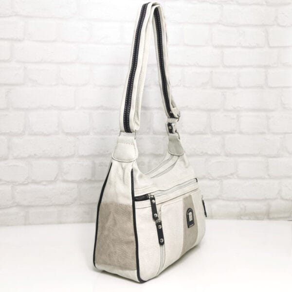 Основен цвят мръсно бял, гарниран със сивеещо бежово и малко черно. Обков сребрист.