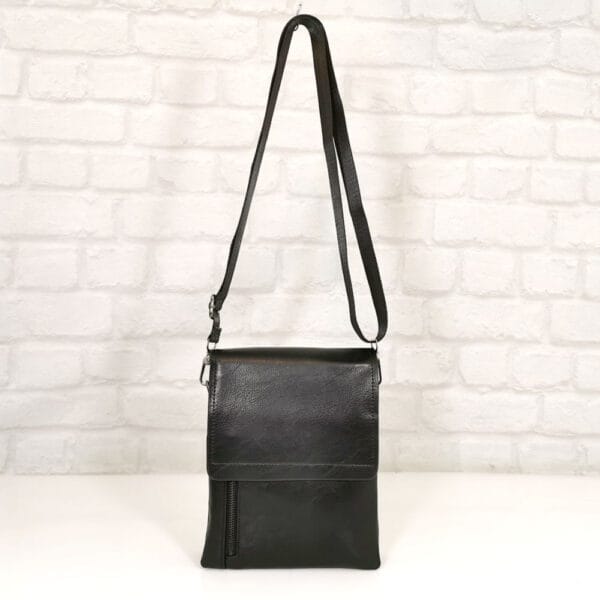 Три отделения-две с цип и едно по средата без закопчаване, един джоб за телефон, отпред под капака джоб без закопчаване и един вертикален с цип, отвън на гърба джоб с цип.