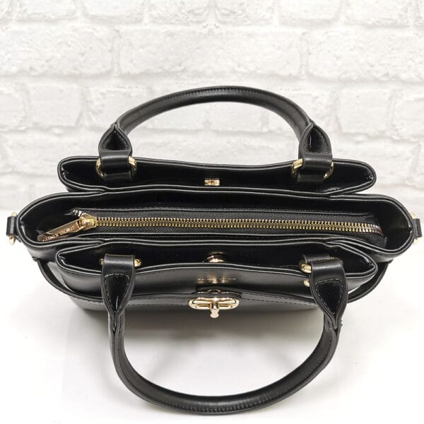 Чантата има три отделни прегради, като две от тях се закопчават с магнитни копчета, а средната с метален цип.