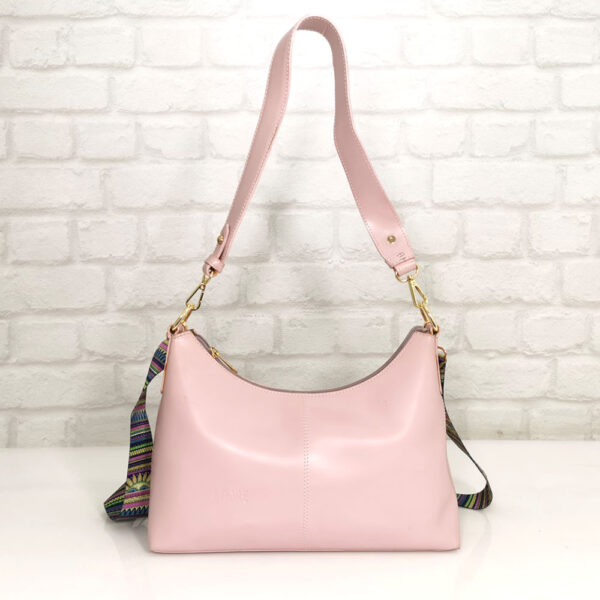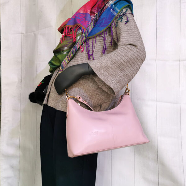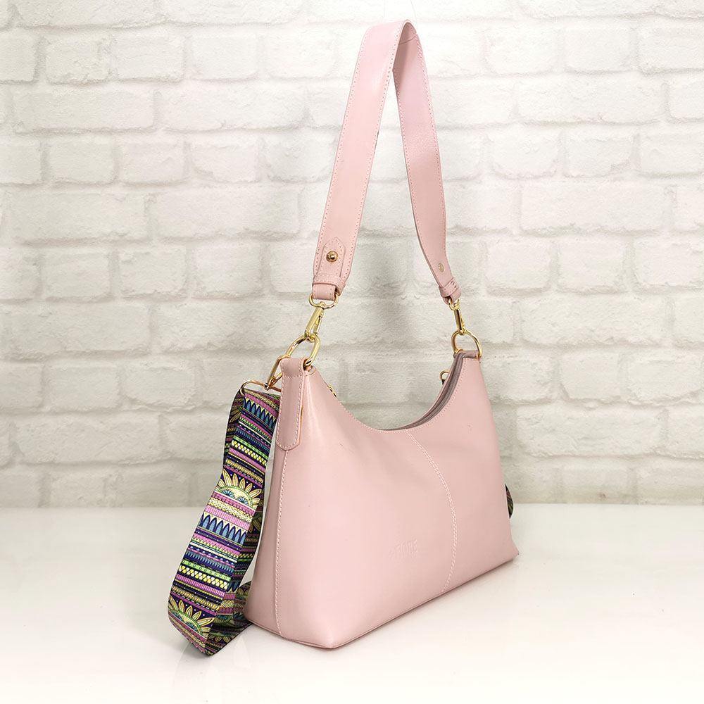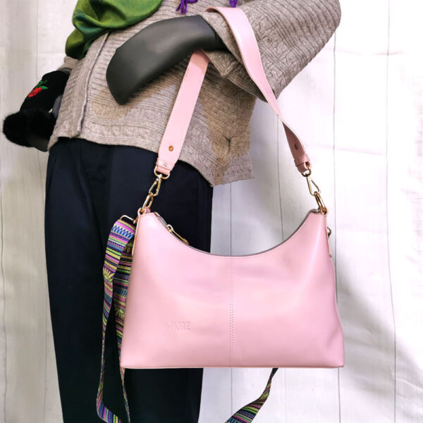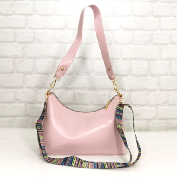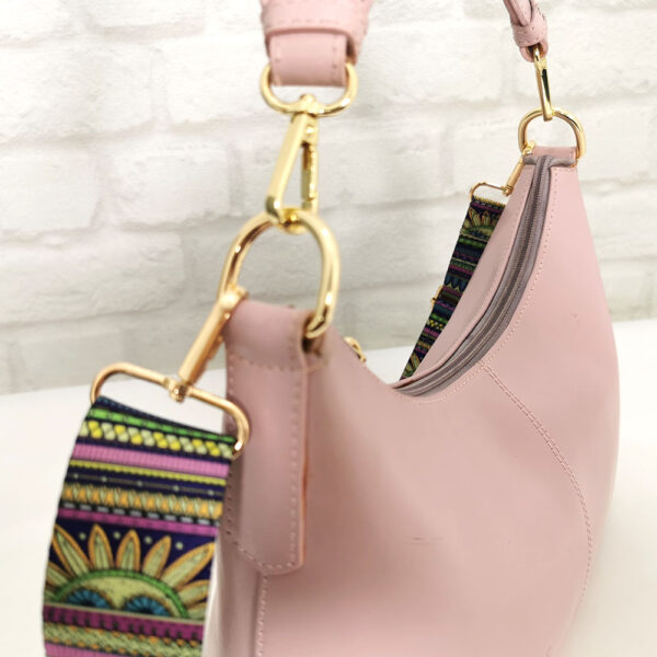Една подвижна кожена дръжка с дължина 55.0 см. удобна за носене на рамо и една подвижна дълга дръжка от пъстра текстилна лента с ширина 3.8 см. и максимална дължина 130.0 см.