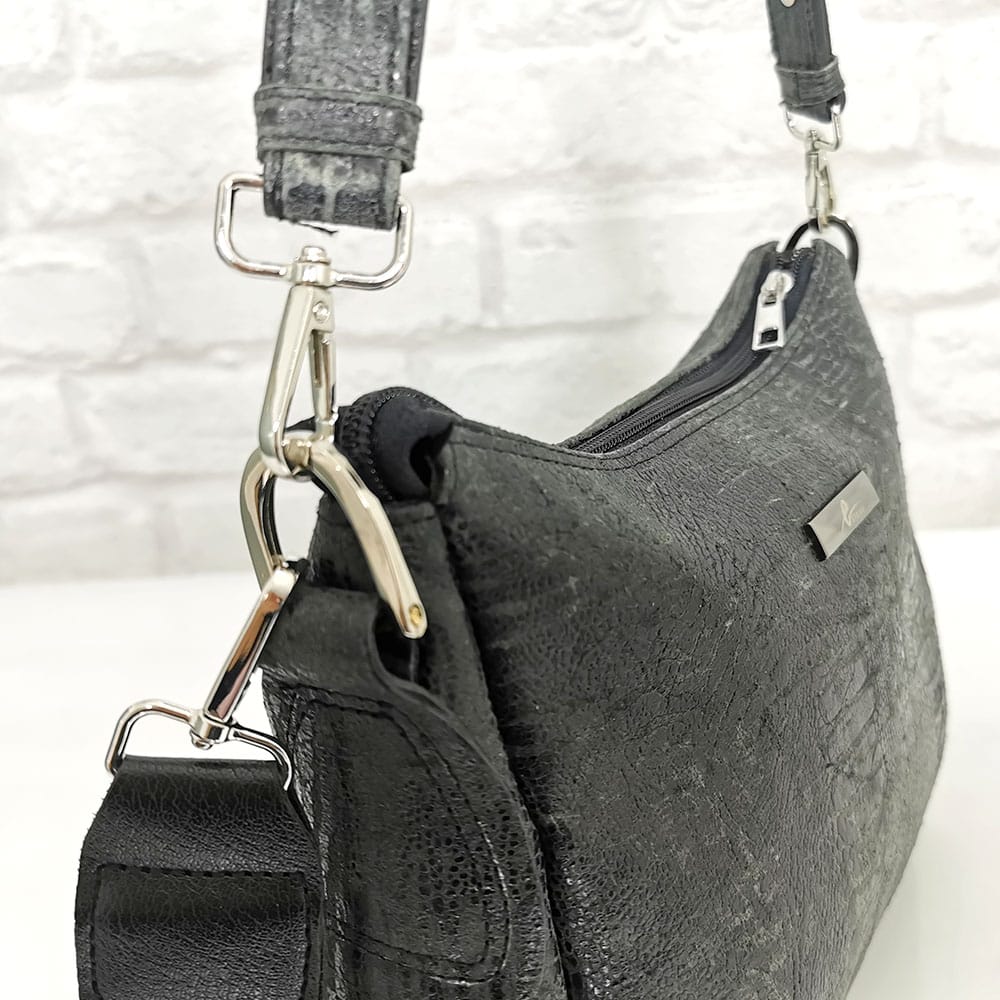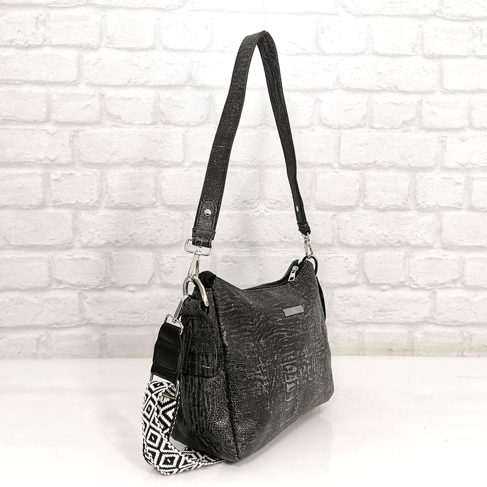 Черен със сив меланж, текстилна лента в черно и бяло, обков сребрист.