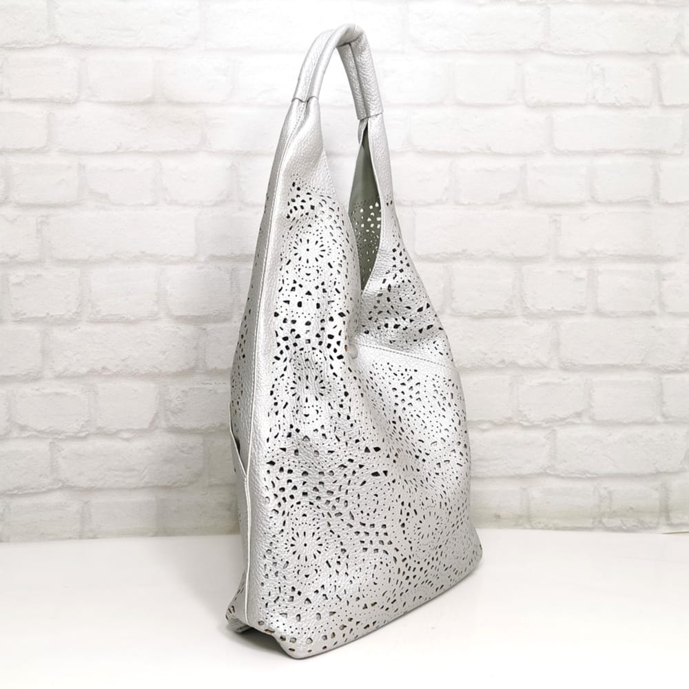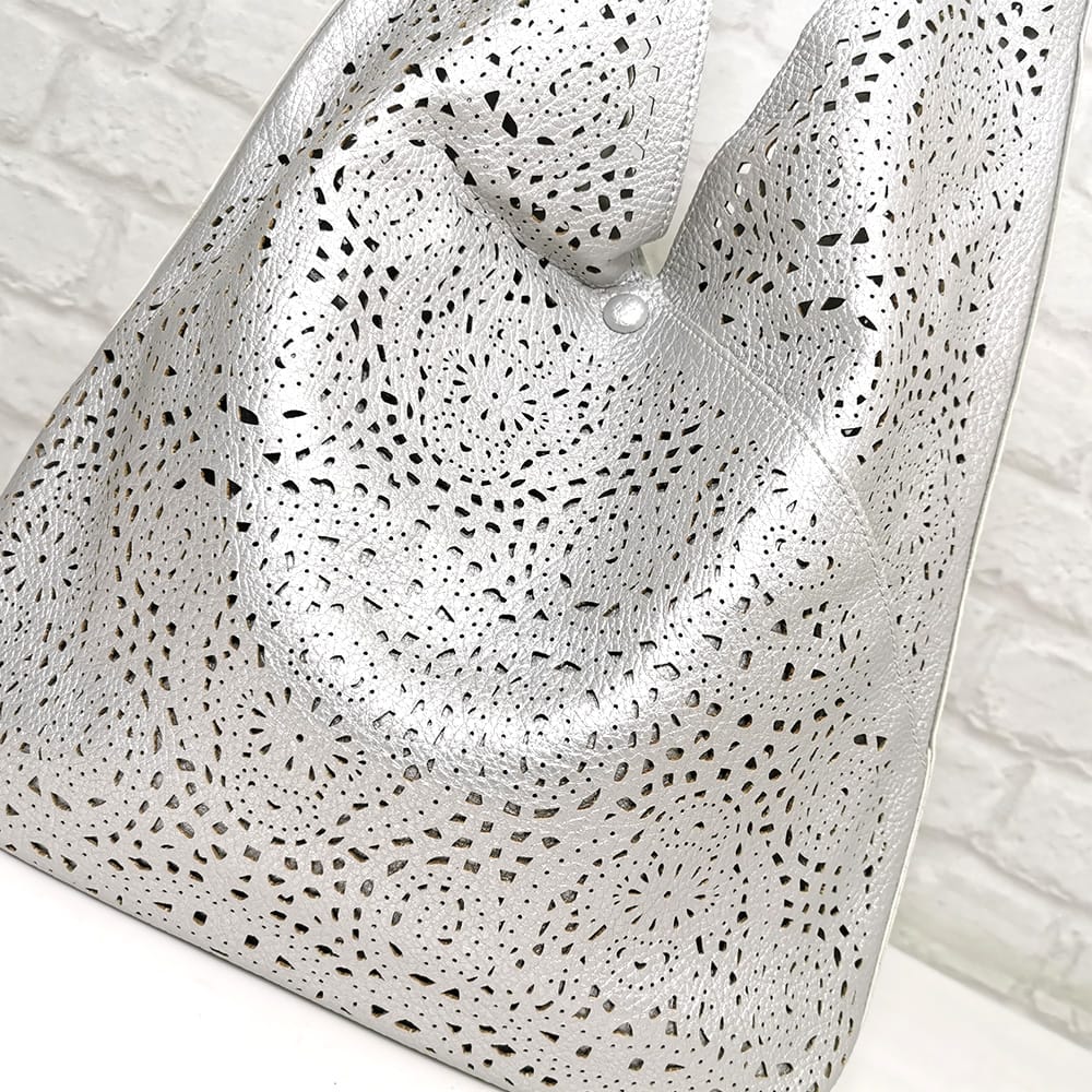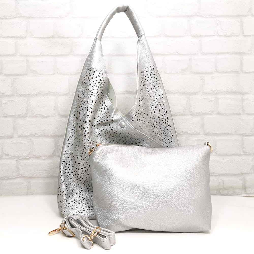 Голямата чанта е без джобове и без хастар, а вътре в малката чанта има малко джобче с цип и два джоба за телефони. Малката чанта се слага в голямата и изпълнява функцията на несесер, също така може да се носи самостоятелно с дълга регулираща се дръжка.