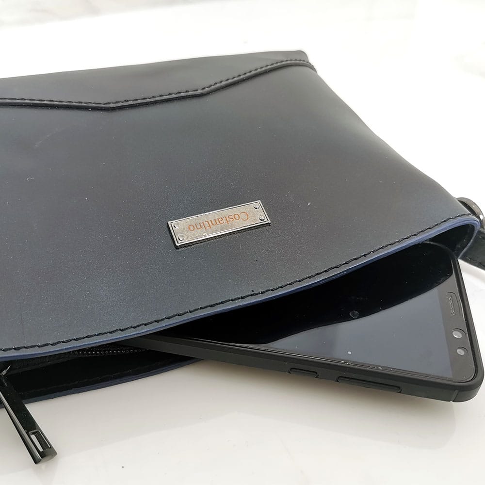 Вътре: един малък джоб с цип и един джоб за телефон. Отвън без джобове.