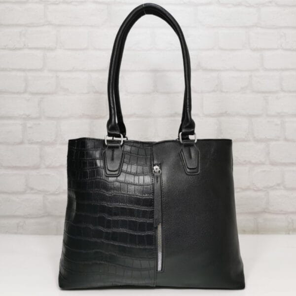 Отвън: на гърба джоб с цип, отпред вертикален джоб с метален цип.