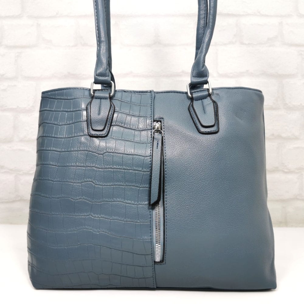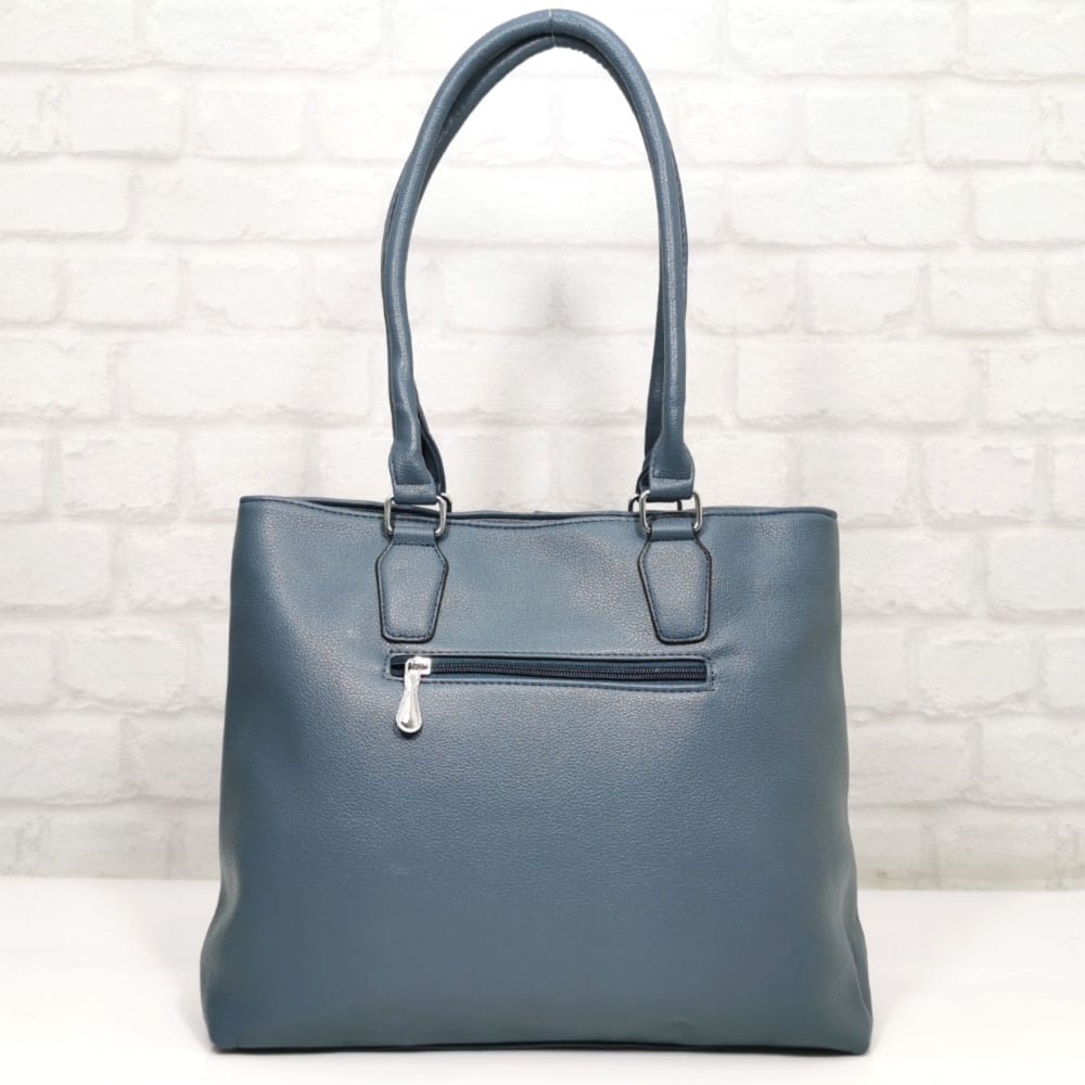 Отвън: на гърба джоб с цип, отпред вертикален джоб с метален цип.
