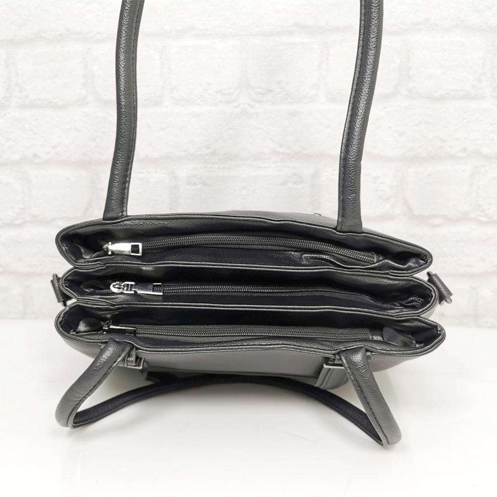 Чантата е с три самостоятелни прегради, като всяка от тях се закопчава с отделен цип.