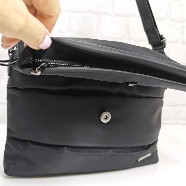 Отвън: самия капак е и джоб с цип и върху капака малък джоб с цип. За да се ползват джобовете, капака трябва да е в изправено положение.