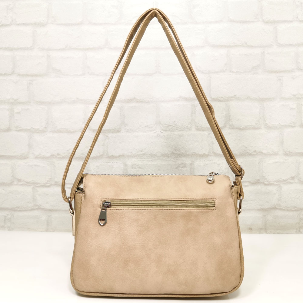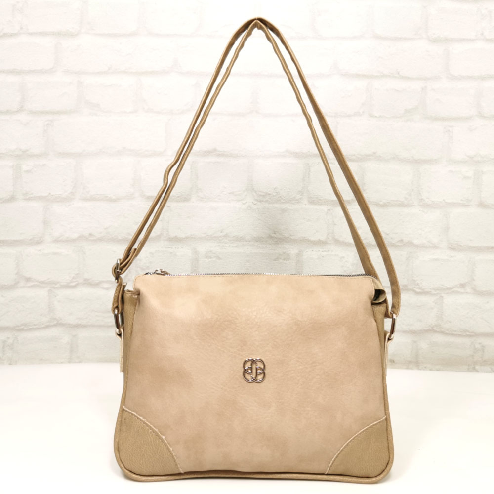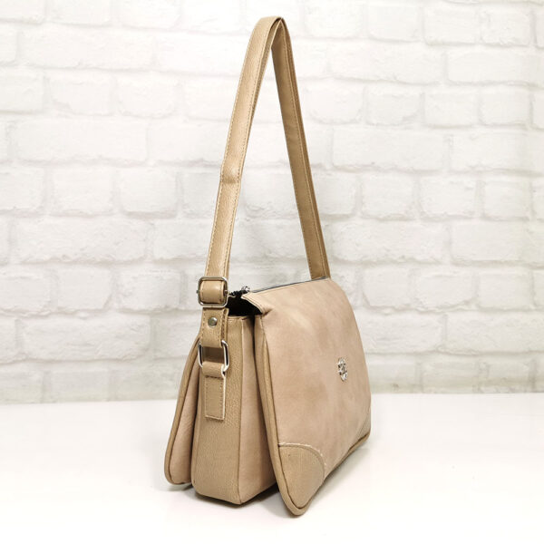Бежов (меланж), комбиниран с тъмно кафяво, обков сребрист.