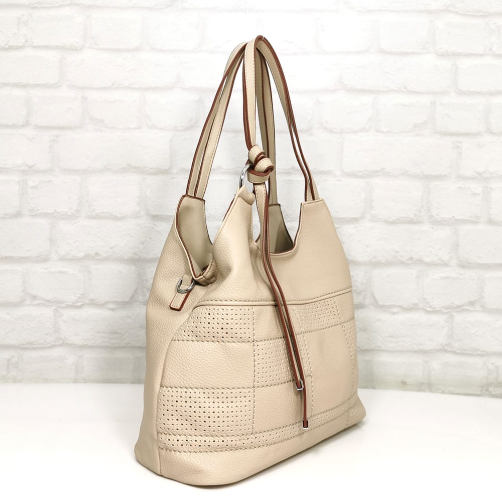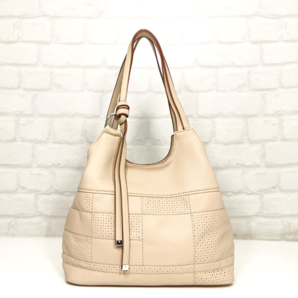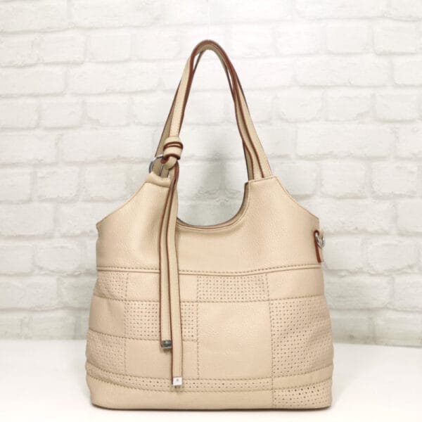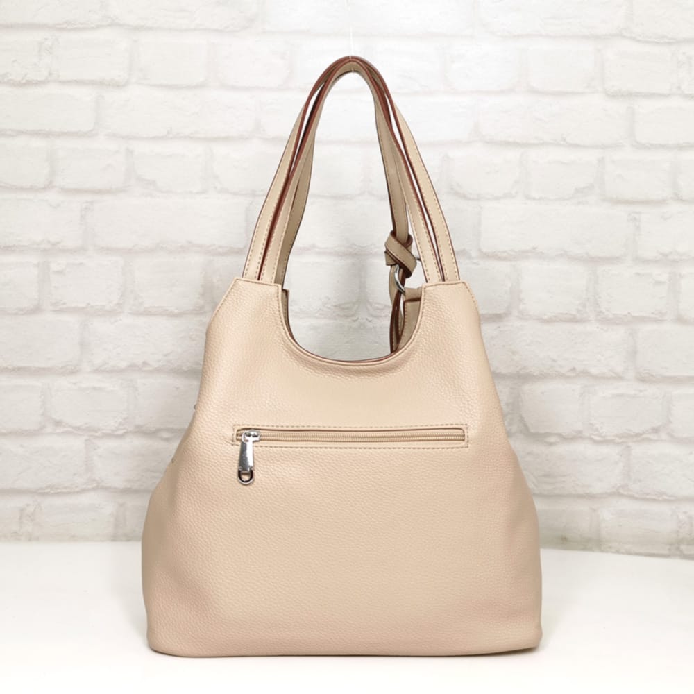 Светло бежова с тъмно бежово обточване на дръжките, обков сребрист.