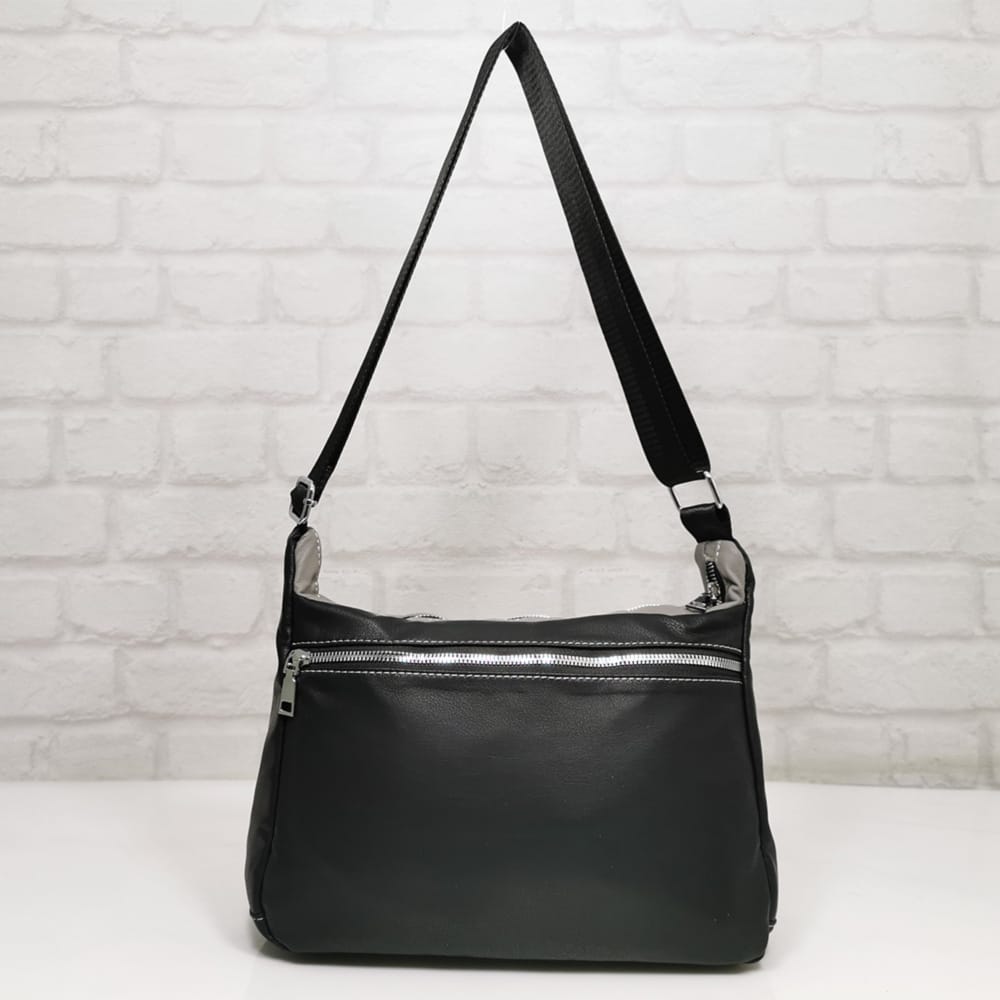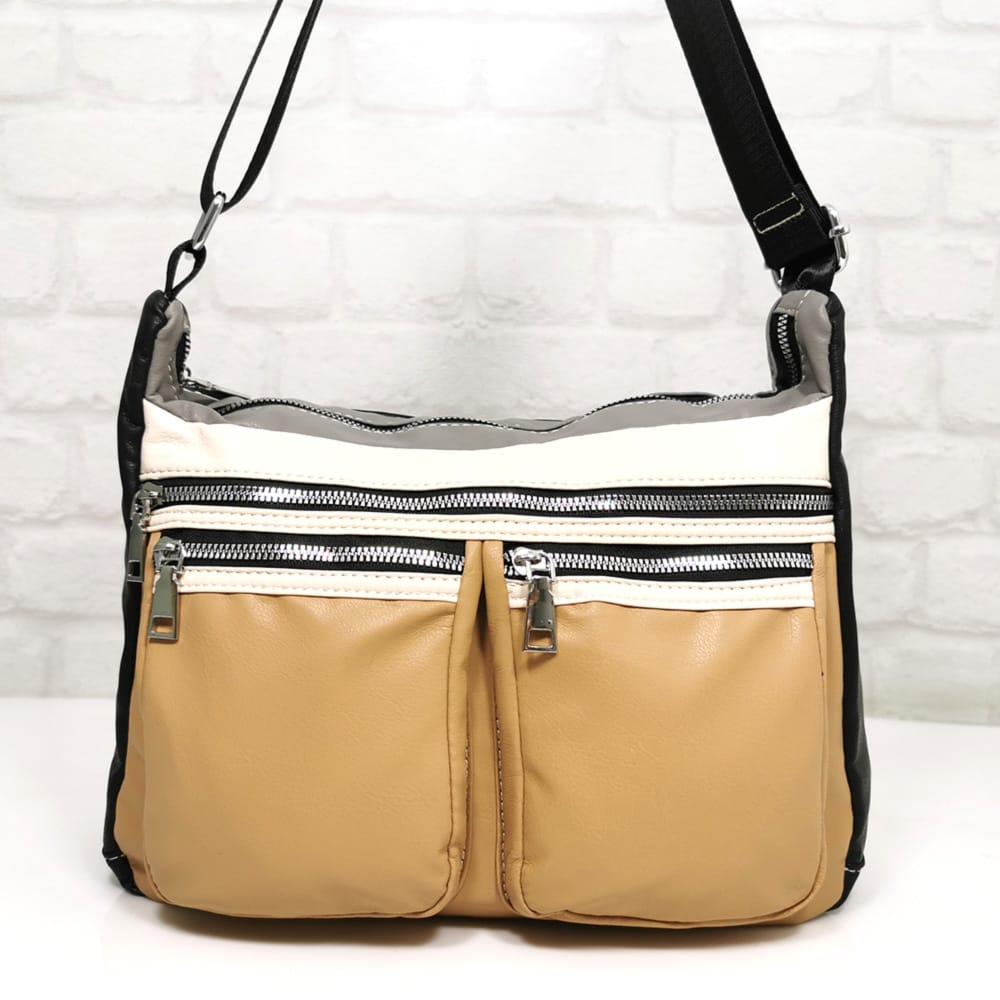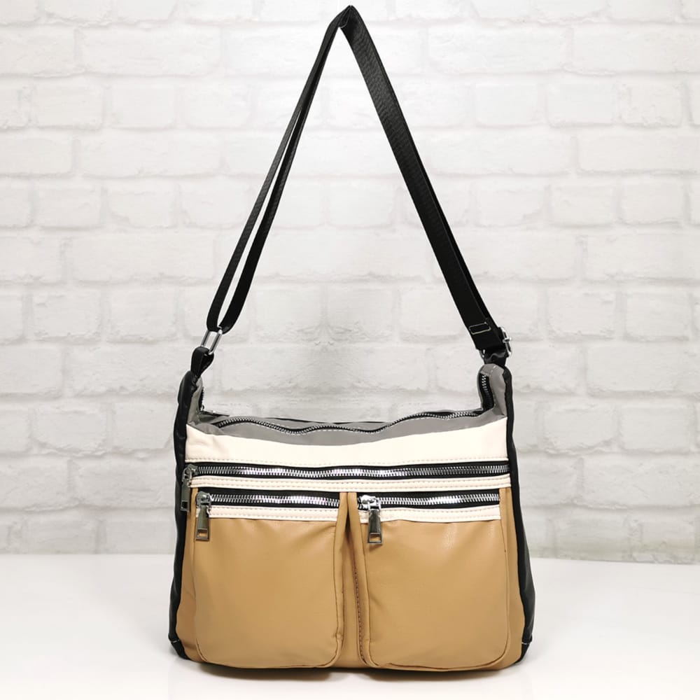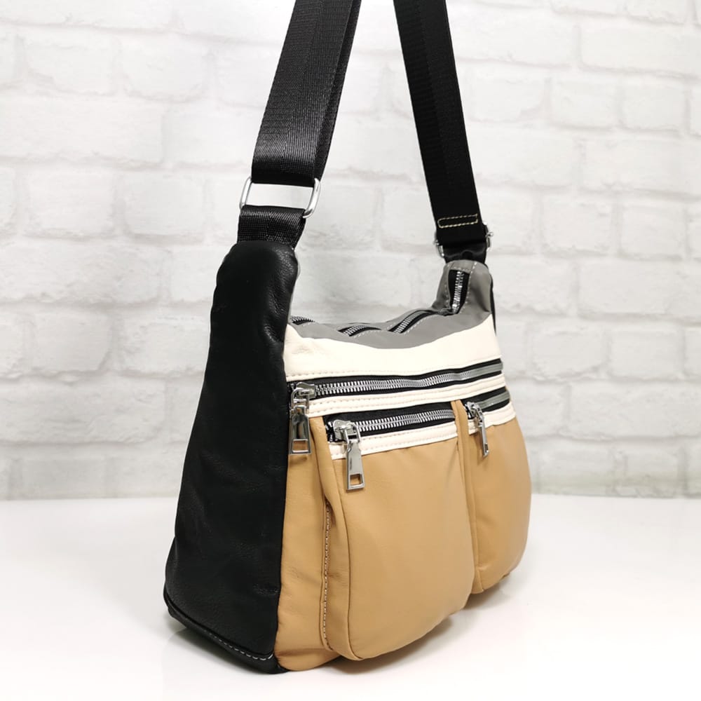 В съчетание от черно, бежово и екрю, обков метален сребрист.