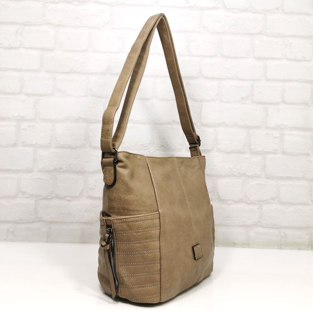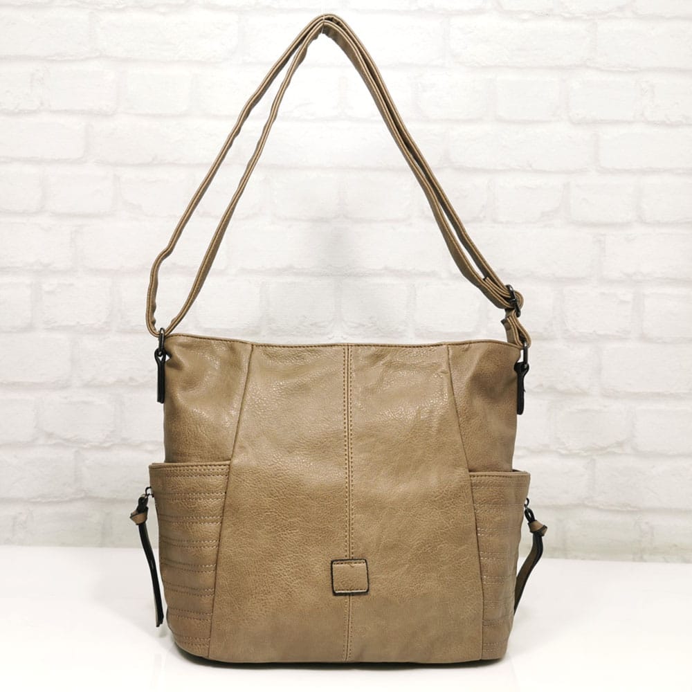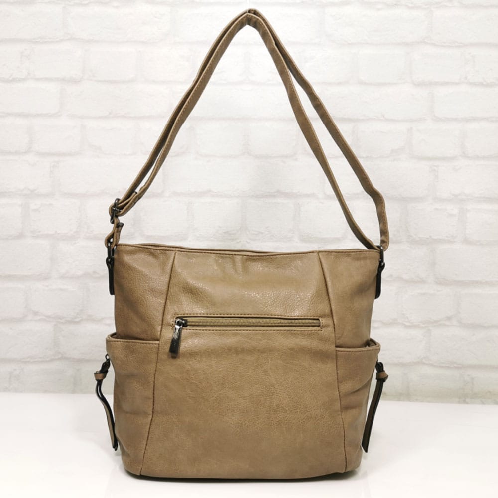 Отвън: на гърба джоб с цип, от двете страни по един джоб с магнитни закопчалки.