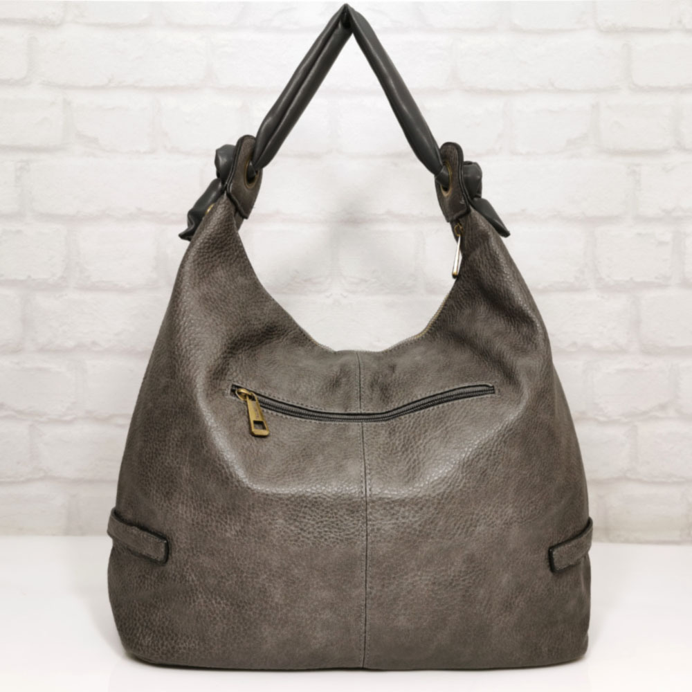 Отвън: на гърба джоб с цип, отпред джоб с метална закопчалка.