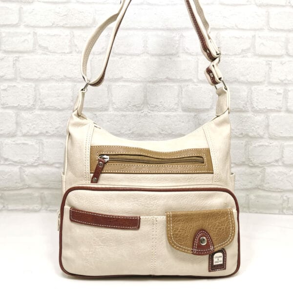 Основен екрю, комбиниран с бежово и малко кафяво.