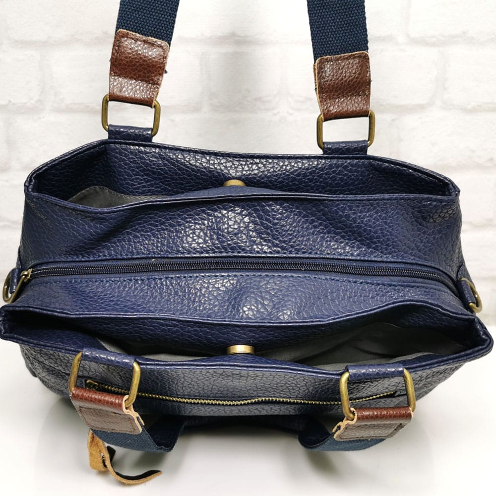 Чантата има три отделения, като средното се закопчава с цип и в него има малко джобче с цип и два джоба за телефони, останалите две отделения се закопчават с магнитни копчета.