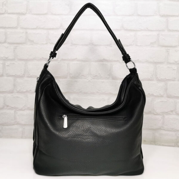 Отвън: на гърба джоб с цип, от двете страни по един джоб с метален цип.