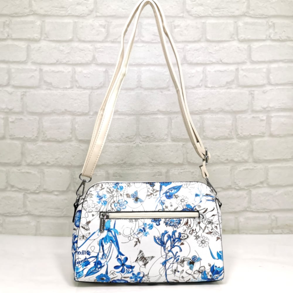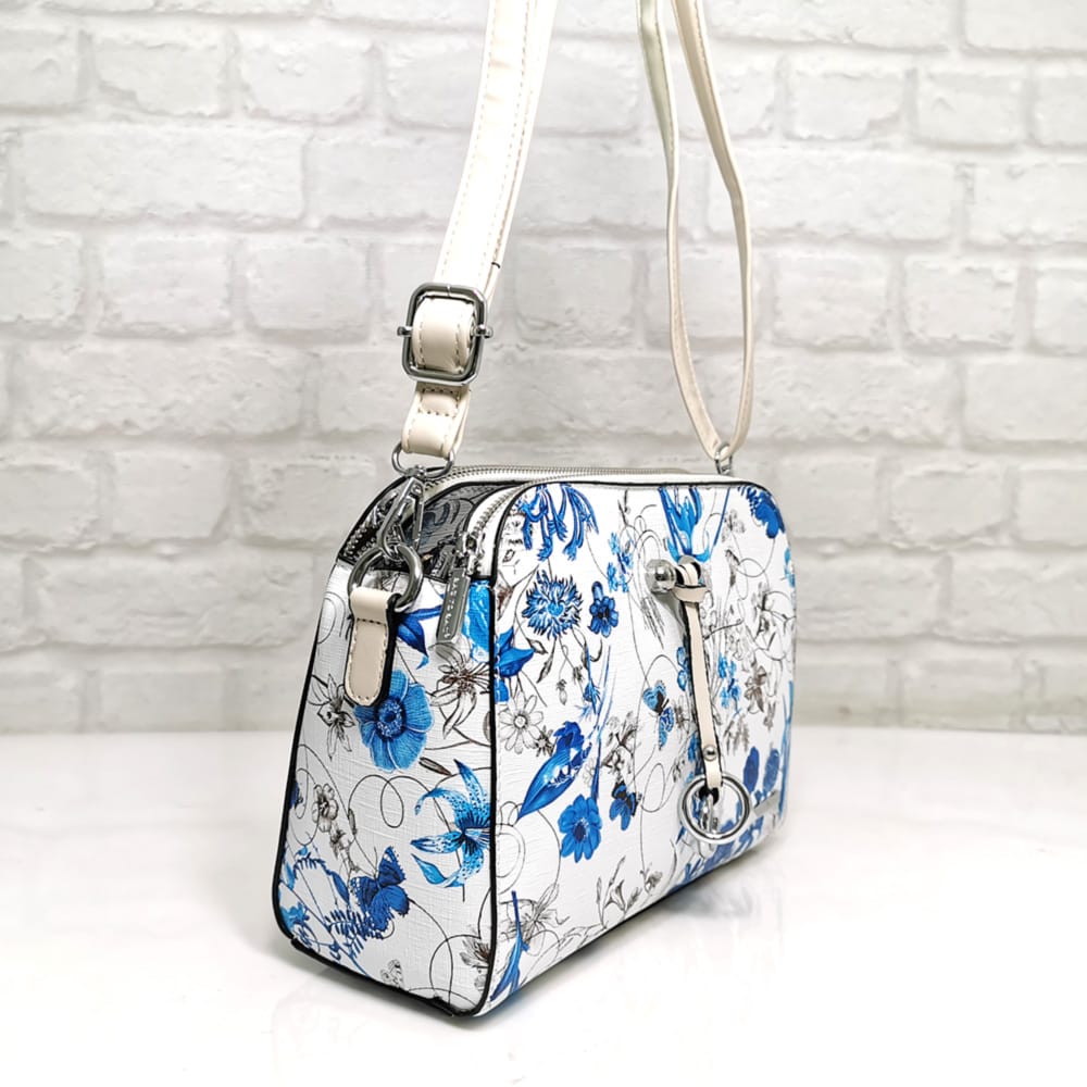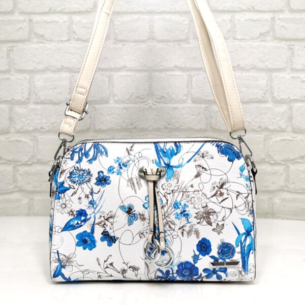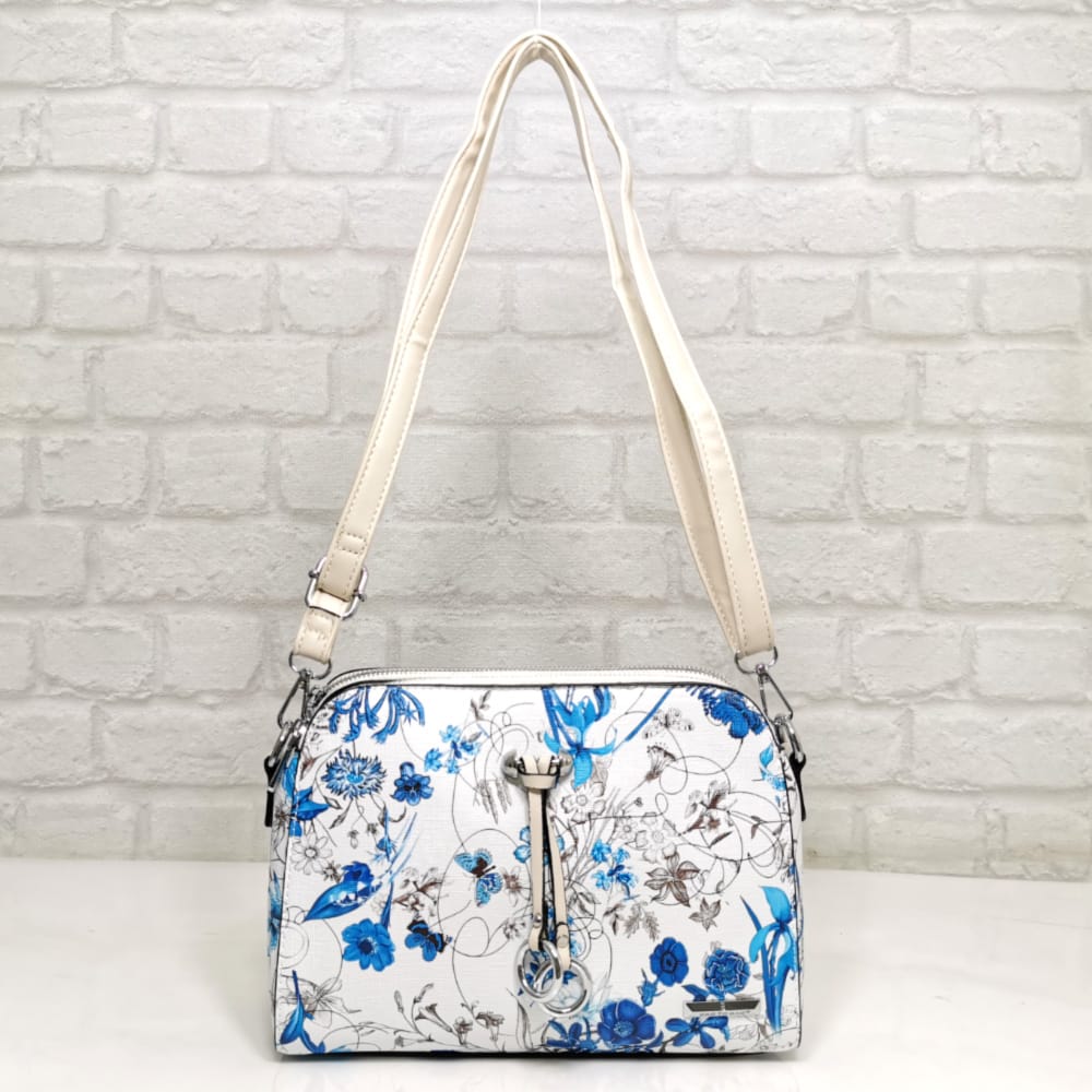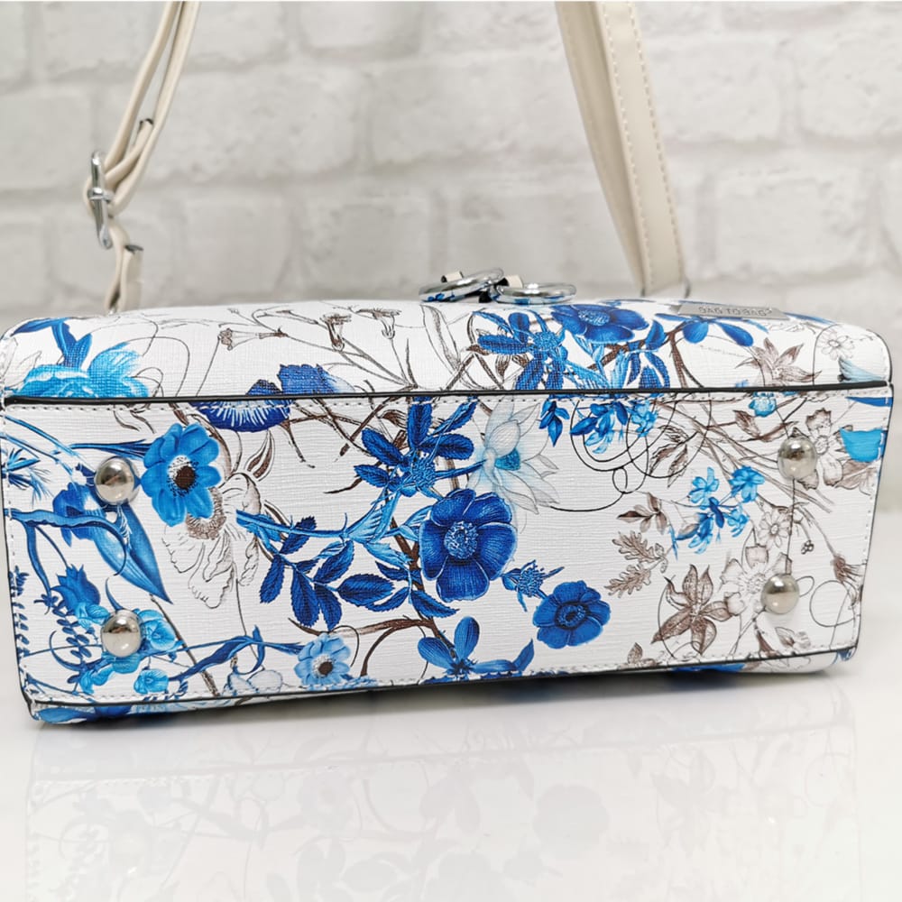 Основен бял със сини и кафяви цветя, дръжка и висулка екрю, обков сребрист.
