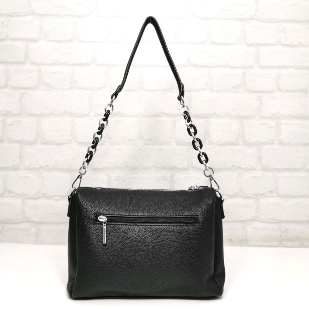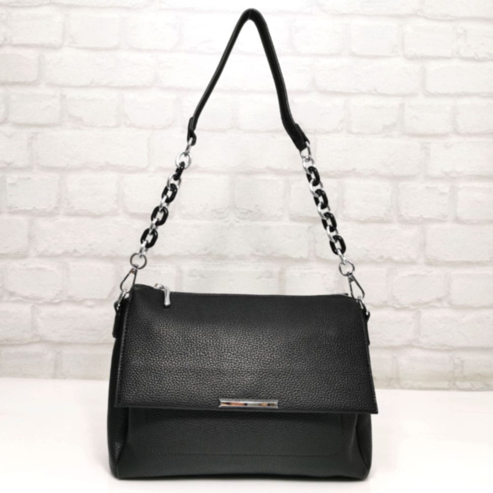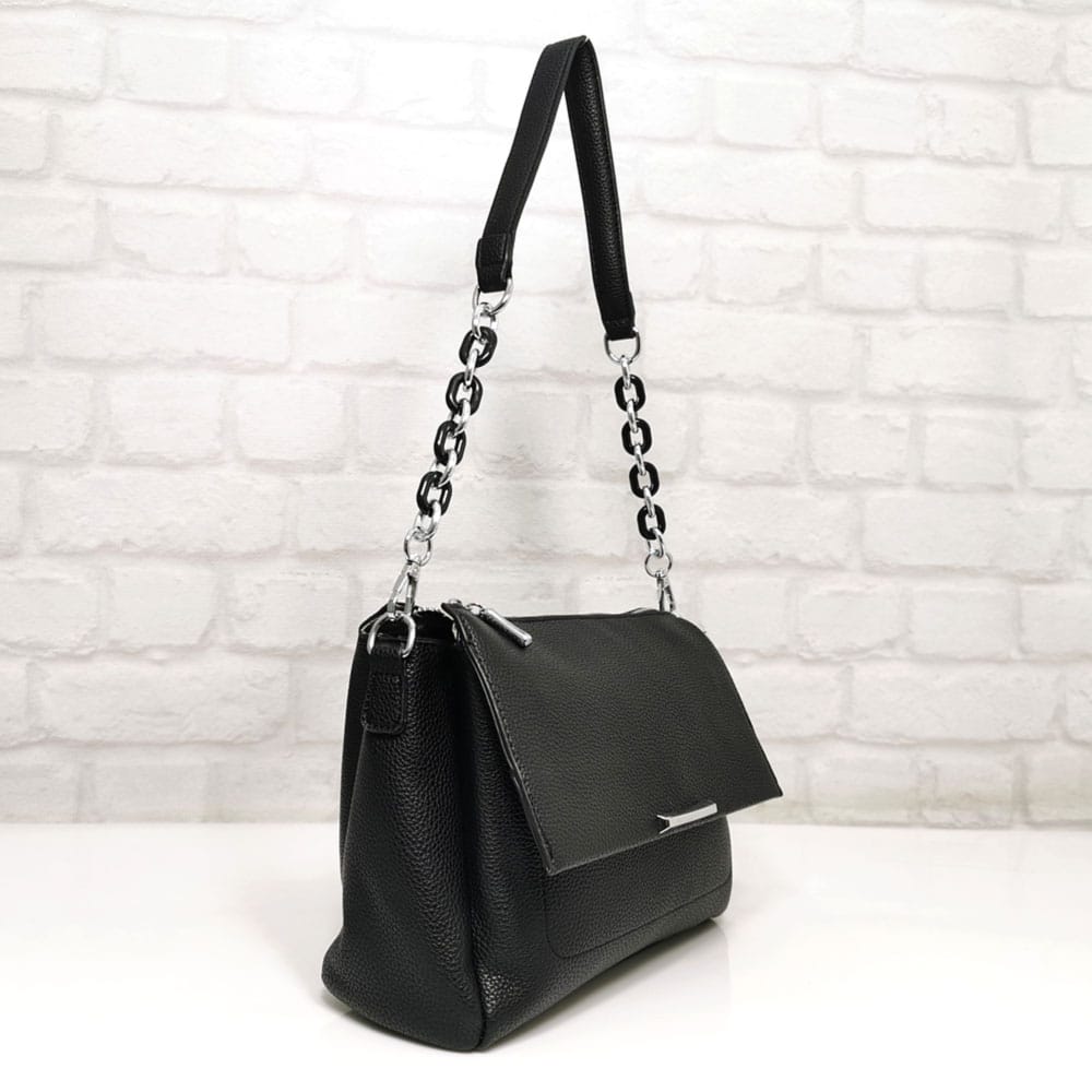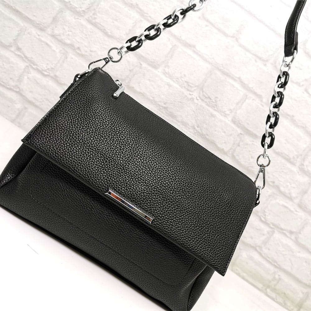 Една подвижна дръжка, комбинация от лек пластмасов синджир и еко кожа, която е удобна за носене на рамо, с дължина 72.0 см. и една дълга регулираща се дръжка, цялата от еко кожа.