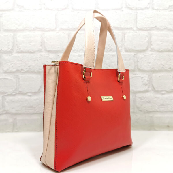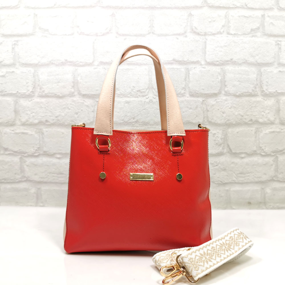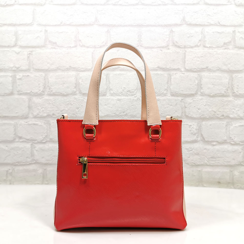 Две къси дръжки за носене на чантата в ръка и една подвижна шарена, текстилна, регулираща се дръжка с максимална дължина 120.0 см. и ширина 4.0 см.