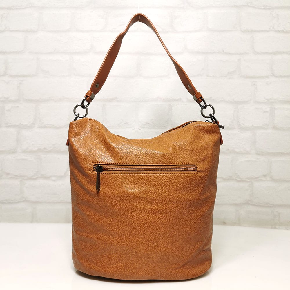 Отвън: на гърба джоб с цип, отпред джоб с метален цип.