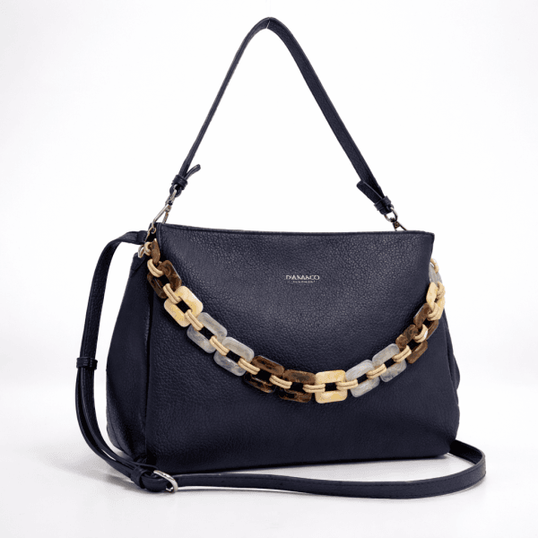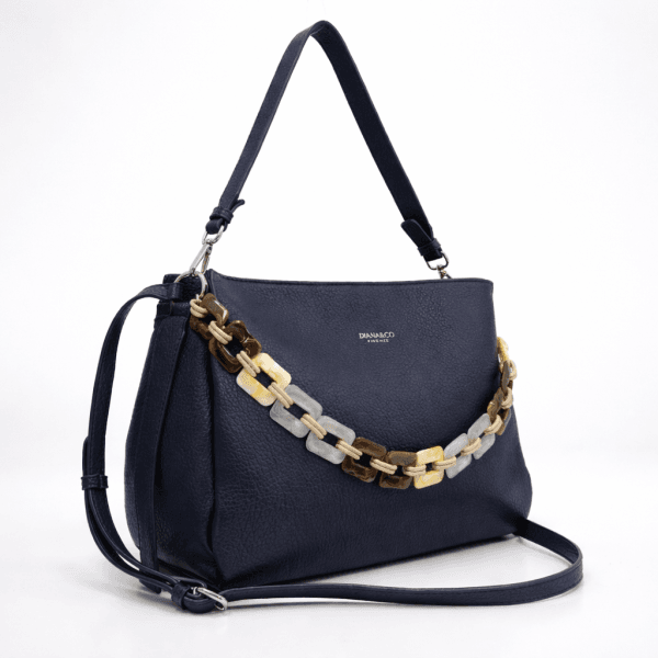 Чанта Diana Co тъмно синя-удобен и практичен модел, допълнен с декоративна верижка за по-интересен завършек удобни дръжки. Чантата е подходяща както за ежедневието, така и за по-елегантни поводи.