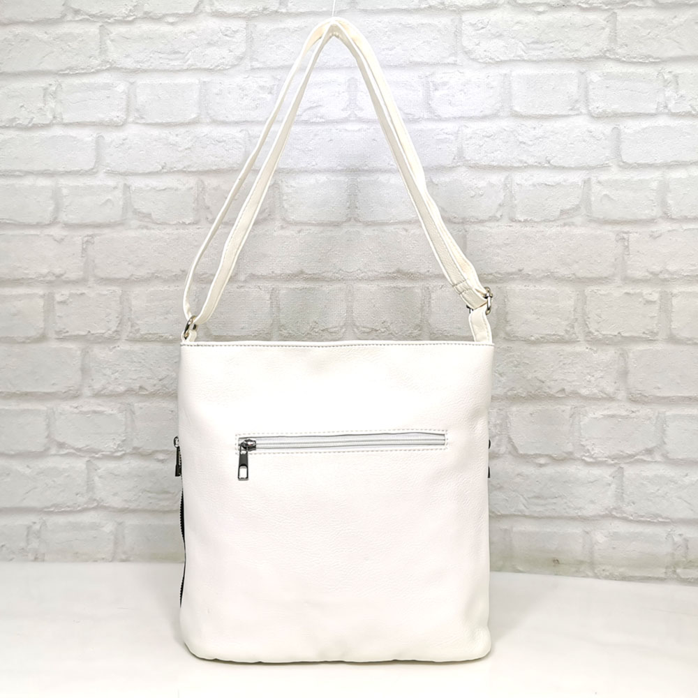 Отвън: на гърба джобче с цип, отпред джоб с метален цип, от двете страни по един джоб с метален цип.