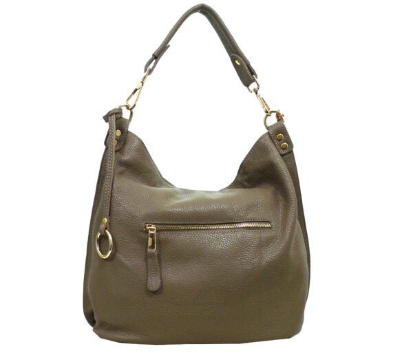 Отвън: на гърба джоб с цип, отпред вертикален джоб с метален цип