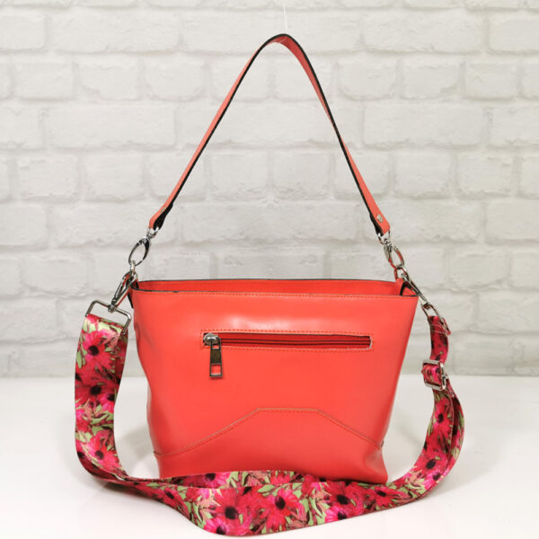 Чудесна дамска чанта в цвят „корал“ от естествена кожа с гланцово покритие, съчетава класически стил и модерна функционалност. Изработена е от гладка, висококачествена естествена кожа и е снабдена с две удобни дръжки: една къса за ръка, но става и за носене на рамо и една широка текстилен дръжка за рамо или кросбоди стил. И двете дръжки могат да се свалят. Подходяща за всякакви поводи – от работен ден до вечерна разходка.Произведена в България!