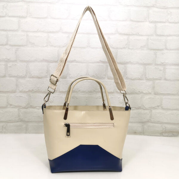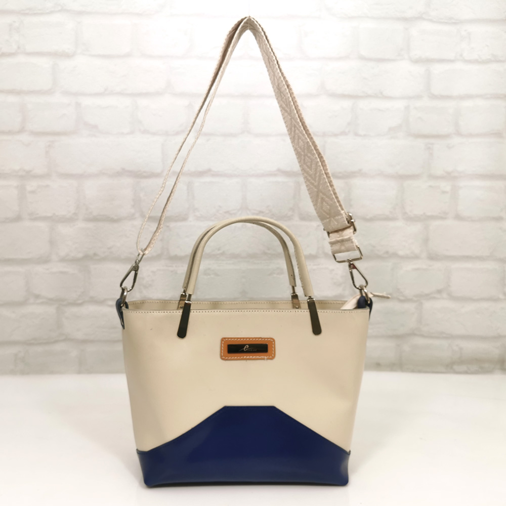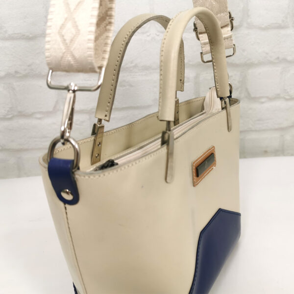 Основен екрю, комбиниран с тъмно син и бежов акцент, текстилна дръжка в бежова гама, обков метален сребрист.