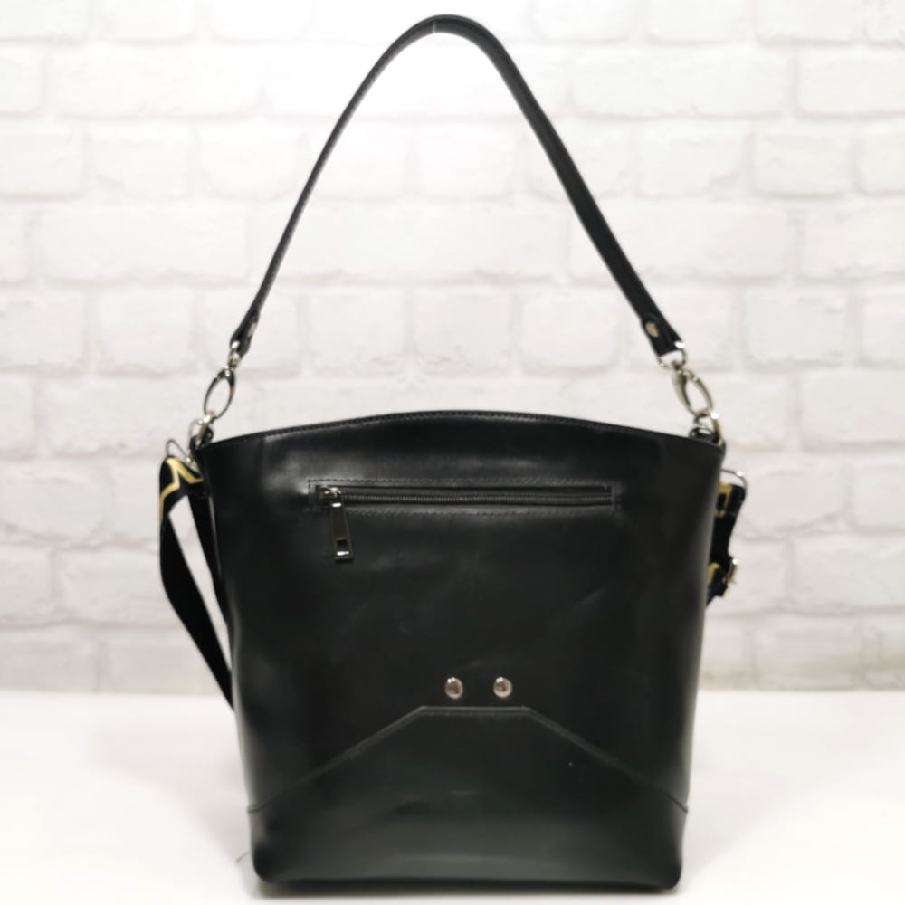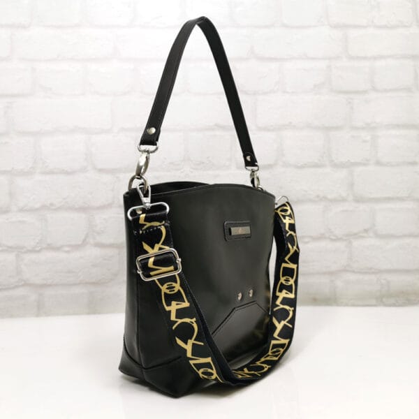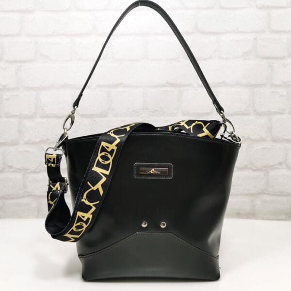 Черен с лъскав ефект, текстилна дръжка многоцветна, обков метален сребрист.