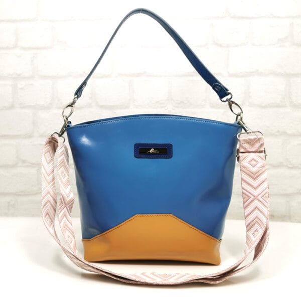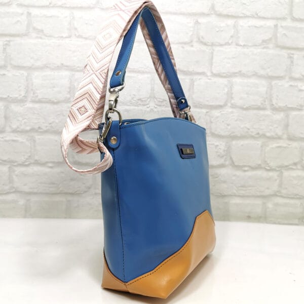 Основен син, комбиниран с „камел“, текстилна дръжка многоцветна, обков метален сребрист.