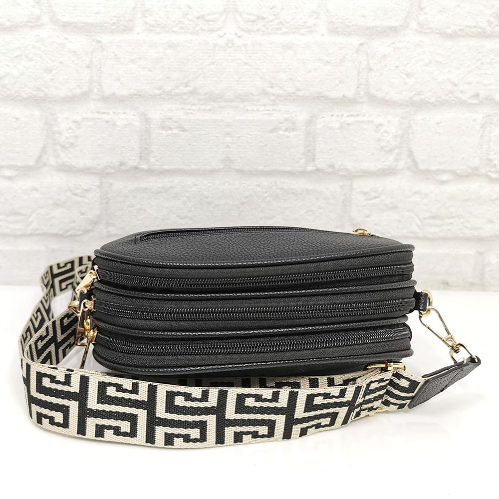 Три отделни прегради, като всяка от тях се закопчава с отделен цип, малко джобче с цип.