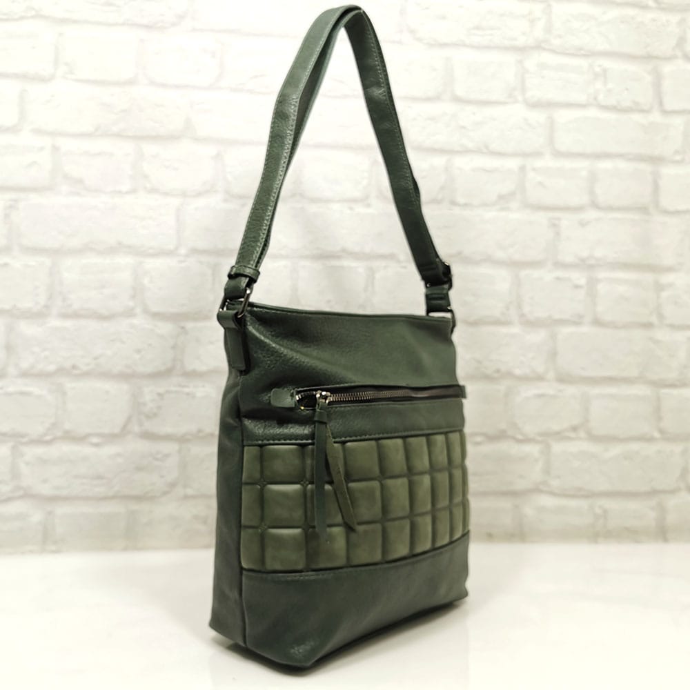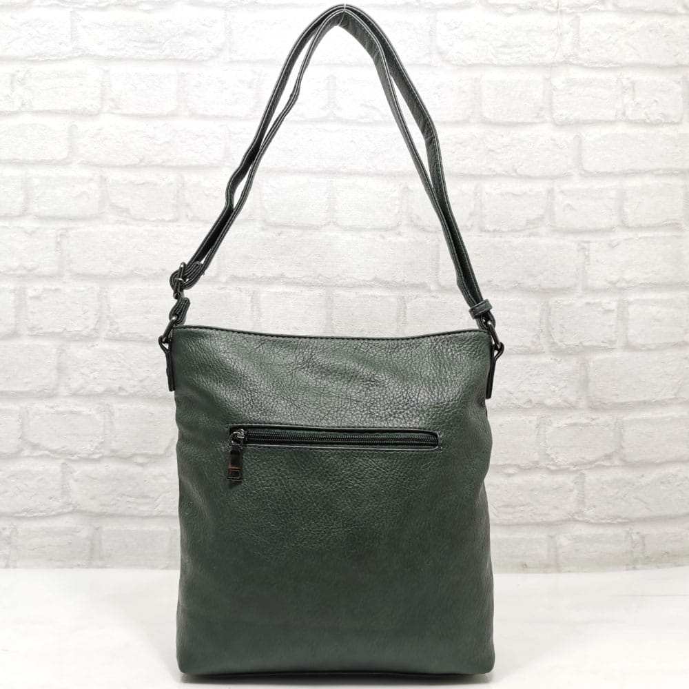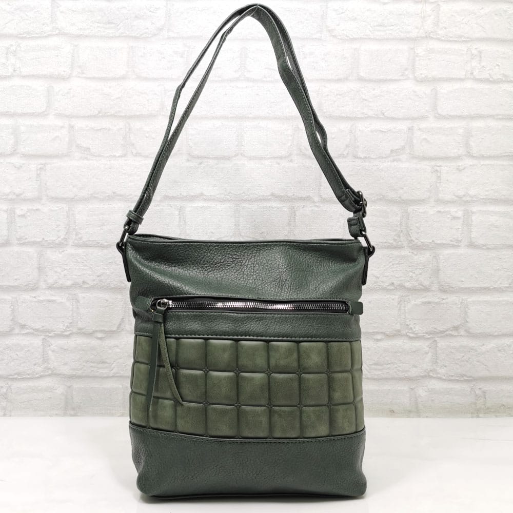 Вътре: средна преграда с цип, малко джобче с цип и два джоба за мобилни телефони.