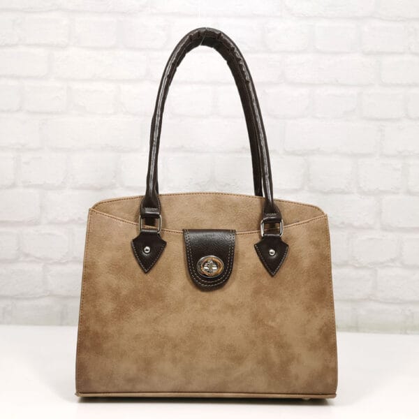 Тъмно бежов, гарниран с тъмно кафяв, обков сребрист.