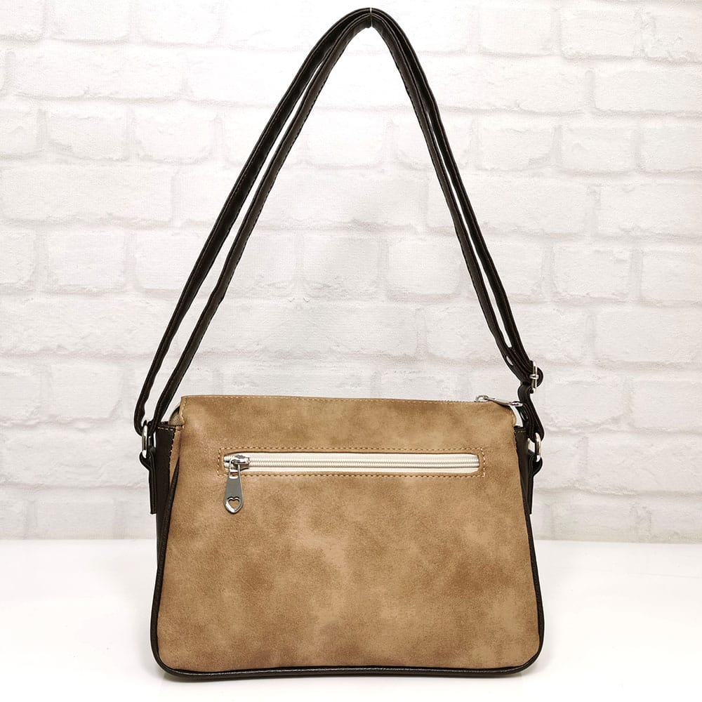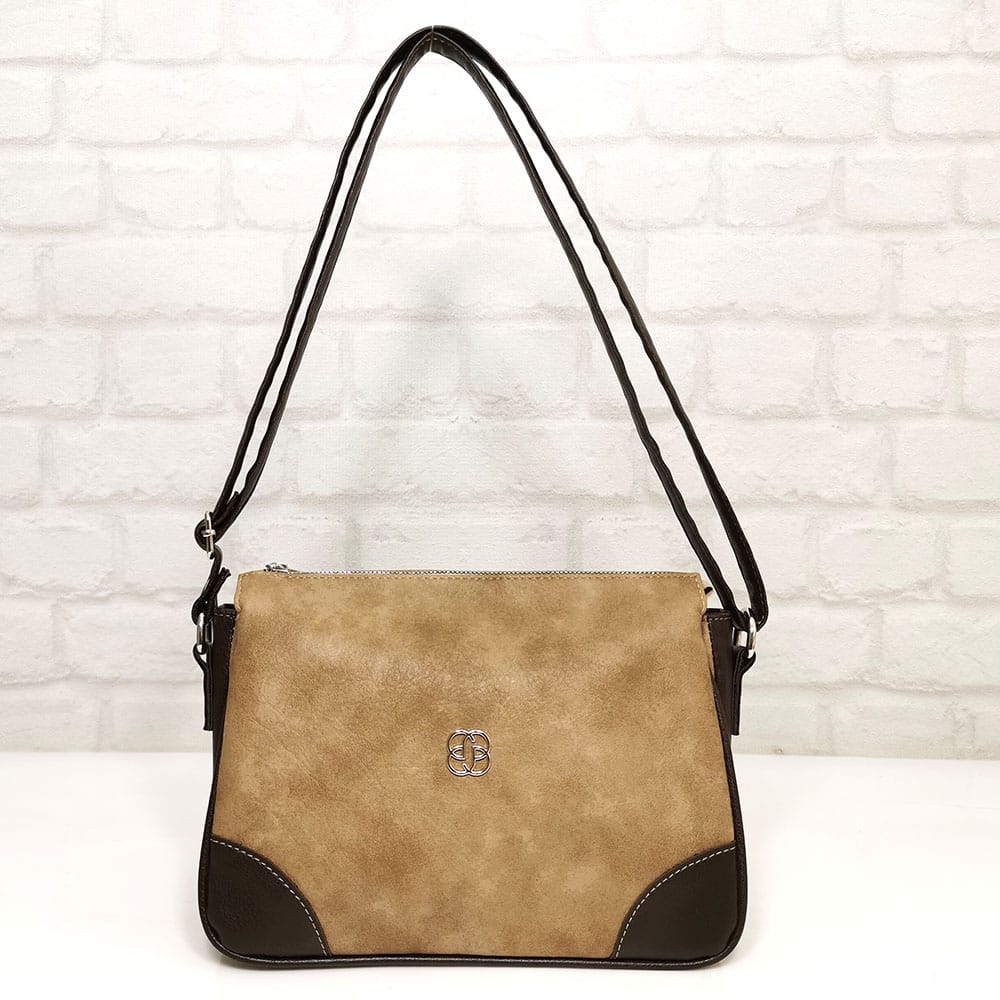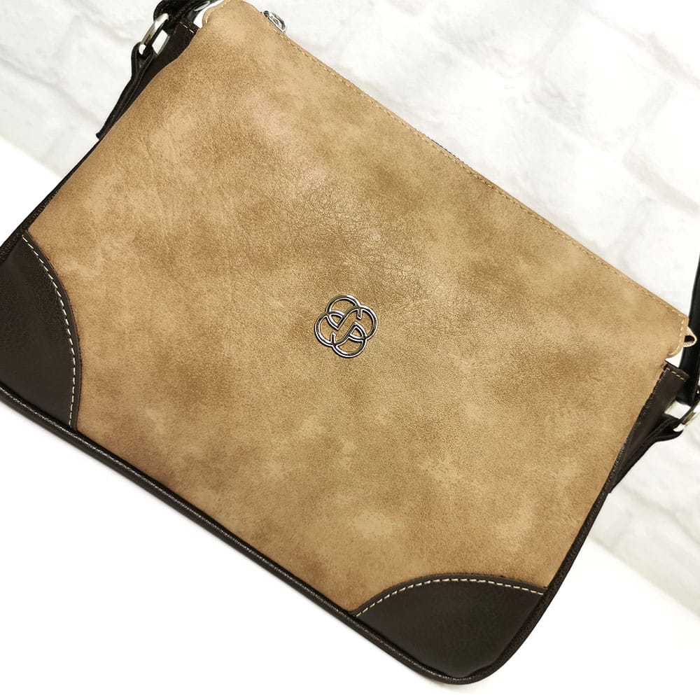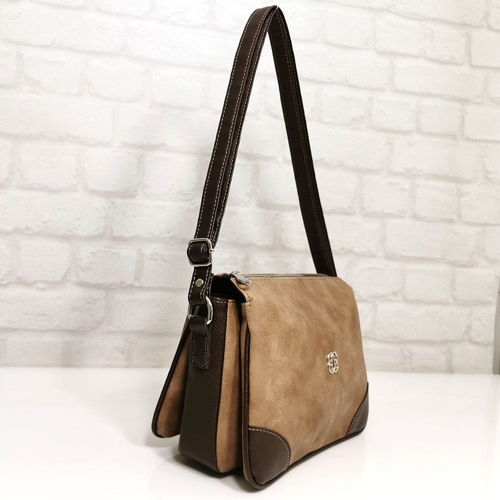 Бежов (меланж), комбиниран с тъмно кафяво, обков сребрист.